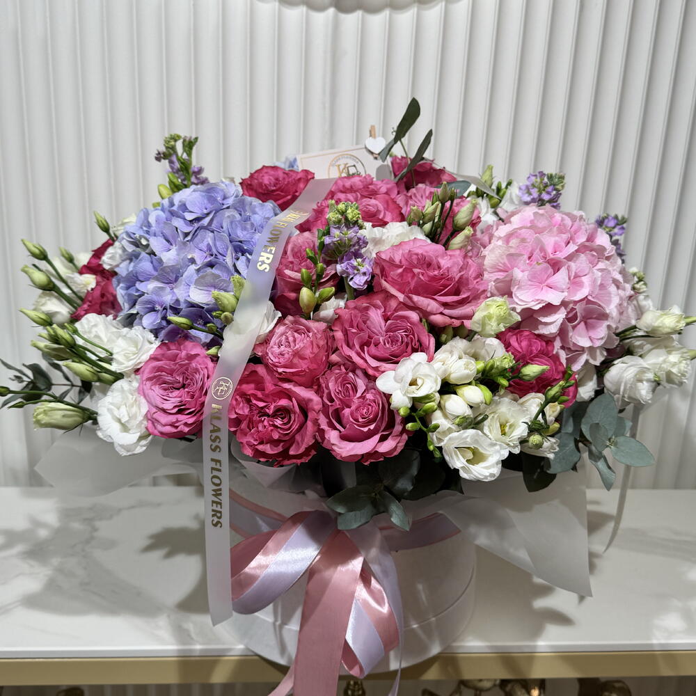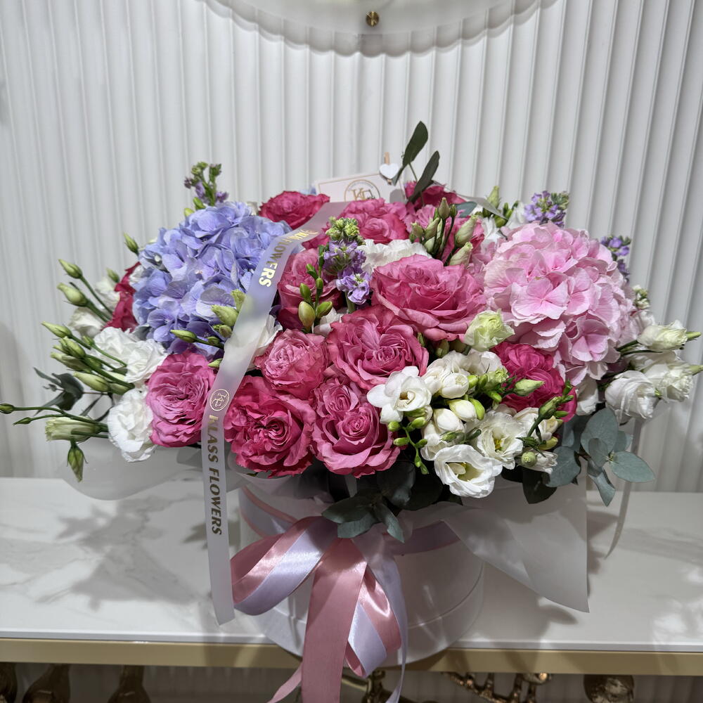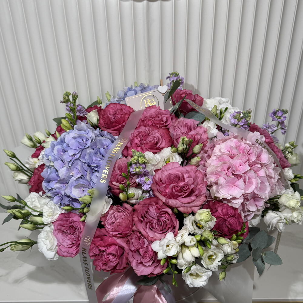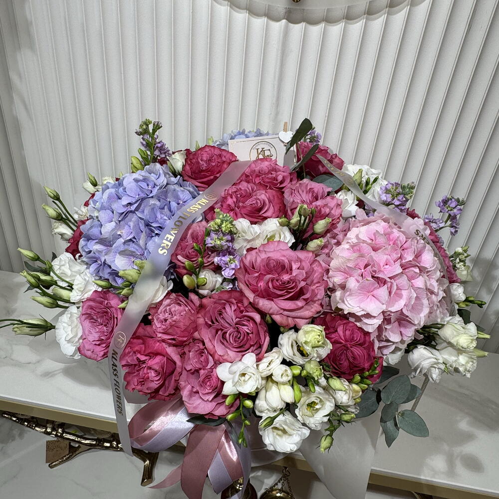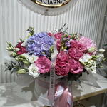 Eustoma - 20 шт. mattiola - 8 шт. eukaliptus - 6 шт. hortensje - 4 шт. róże - 25 шт. frezja - 15 шт.