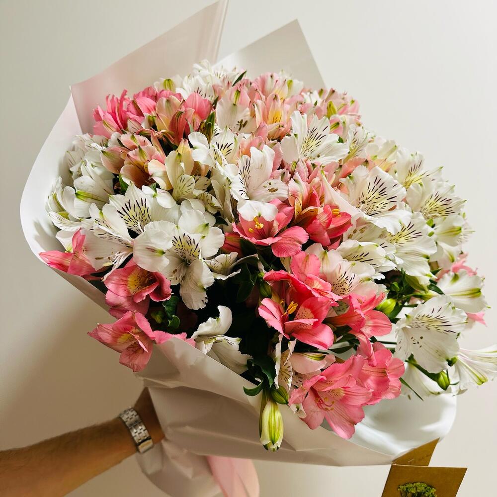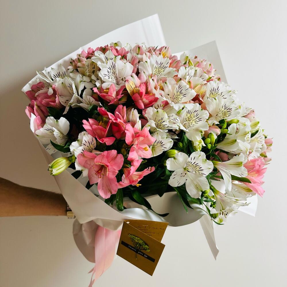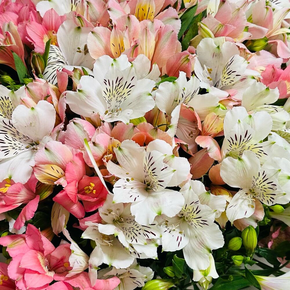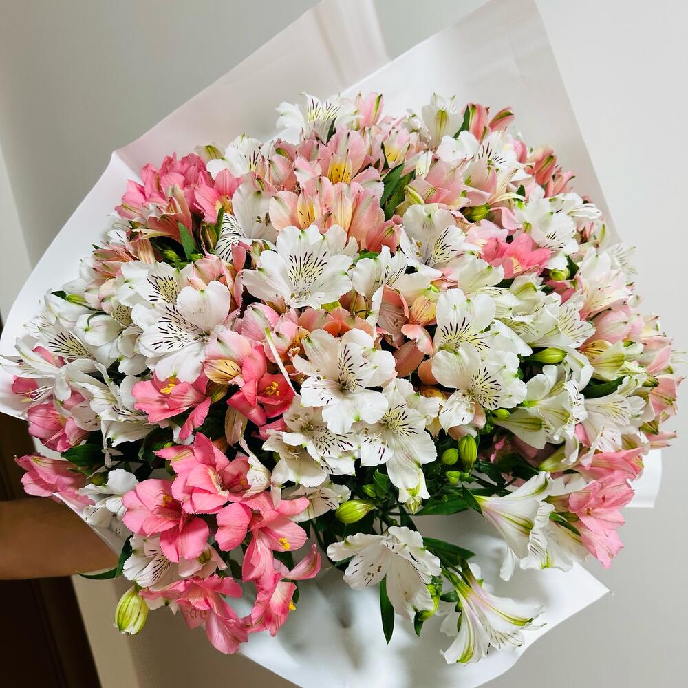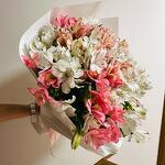Подарите своим близким незабываемые эмоции с этим великолепным букетом! В состав входят нежные розовые и белые альстромерии с изысканными пятнистыми лепестками. Букет аккуратно завернут в белую бумагу с золотой печатью, что придает ему особый шарм. Особенности: Разнообразие цветов и оттенков Свежесть и пышность композиции Идеально подходит для любого повода Закажите сейчас и порадуйте своих любимых этим прекрасным букетом! 🌷