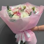 Eustoma - 2 шт. Eucalyptus - 1 шт. Hydrangea - 1 шт. rose - 3 шт. carnation - 3 шт.