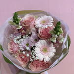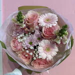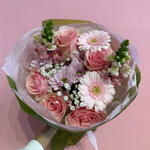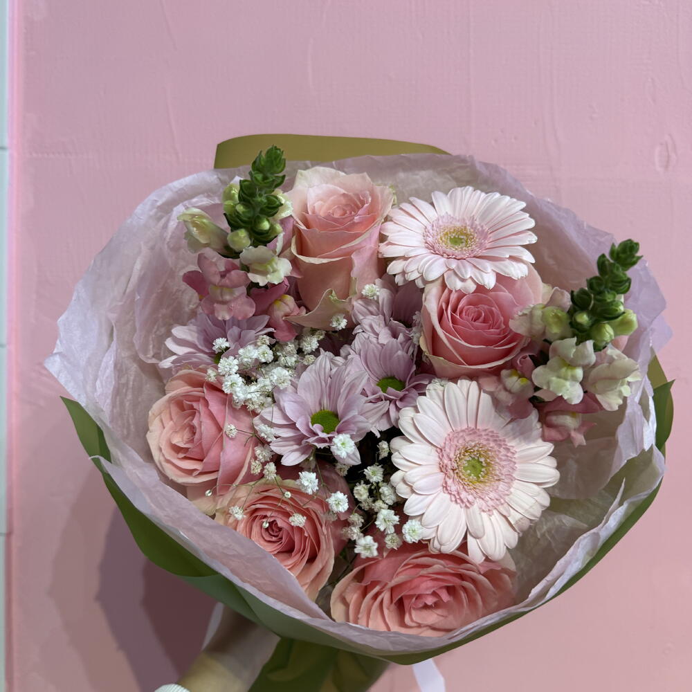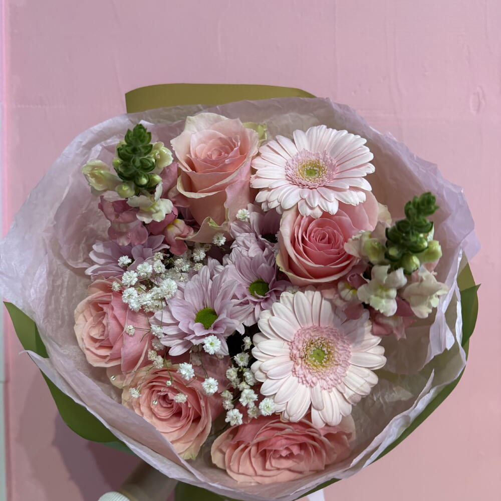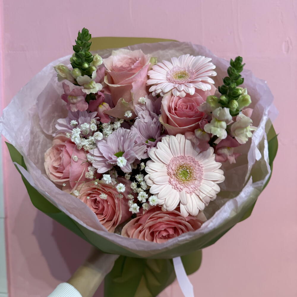 Очаровательный, полный свежести букет в оттенках розового и белого, в котором гармонично сочетаются маргаритки, герберы, львиный зев и розовые розы. Нежная гипсофила окутывает композицию лёгкой дымкой, придавая ей романтический и утончённый характер. Это букет, излучающий тепло, радость и женственное очарование. Идеальный подарок, чтобы выразить симпатию, благодарность или просто подарить немного улыбки близкому человеку.