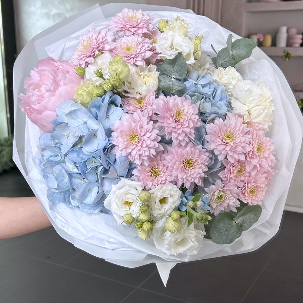 Eustoma - 3 шт. Eucalyptus - 3 шт. oxypetalum - 1 шт. гортензия - 2 шт. goździk - 3 шт. хризантема - 3 шт. piwonia - 1 шт.