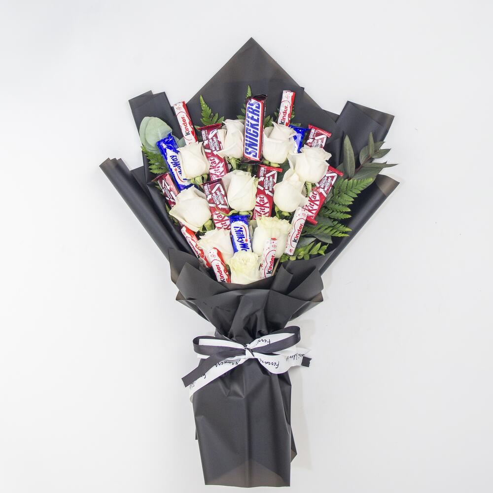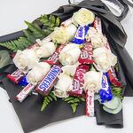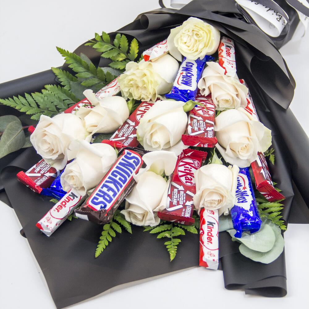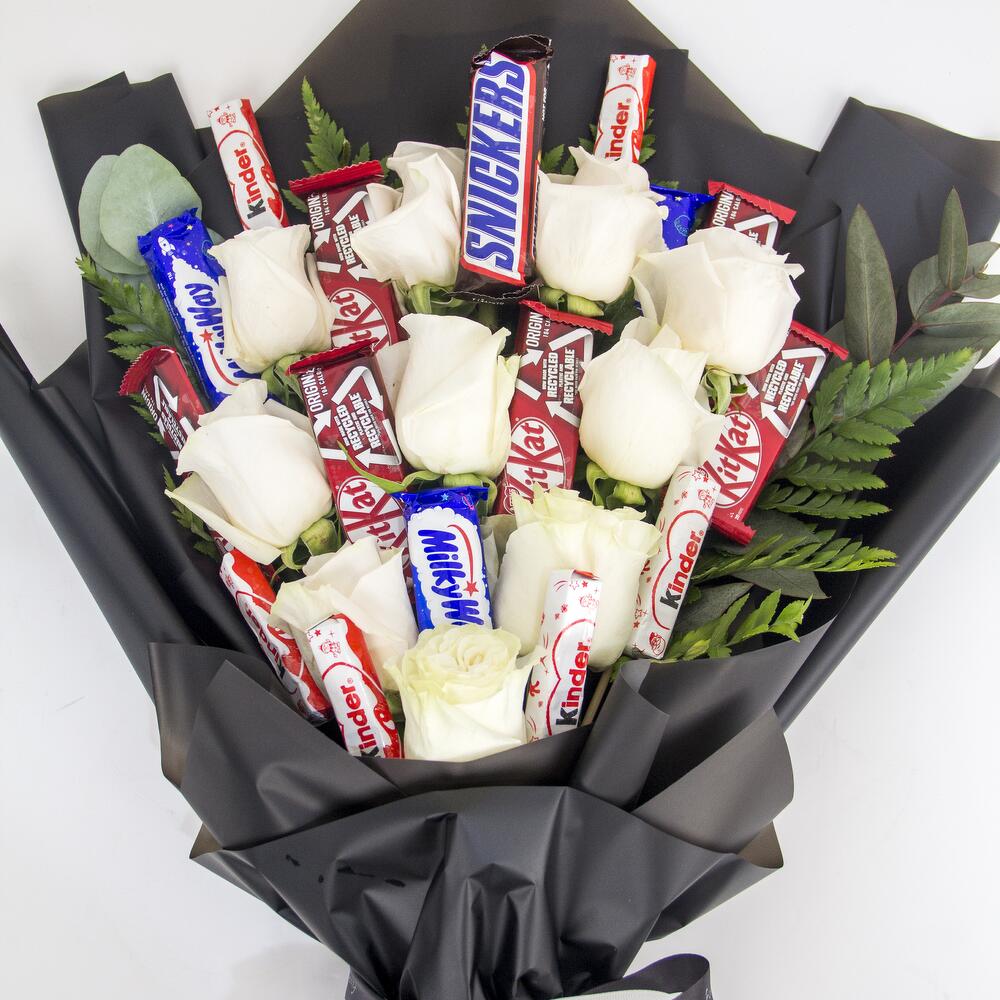 White rose - 10 шт. chocolates - 15 шт. eucalyptus leaves - 2 шт. кожистый папоротник - 3 шт.