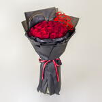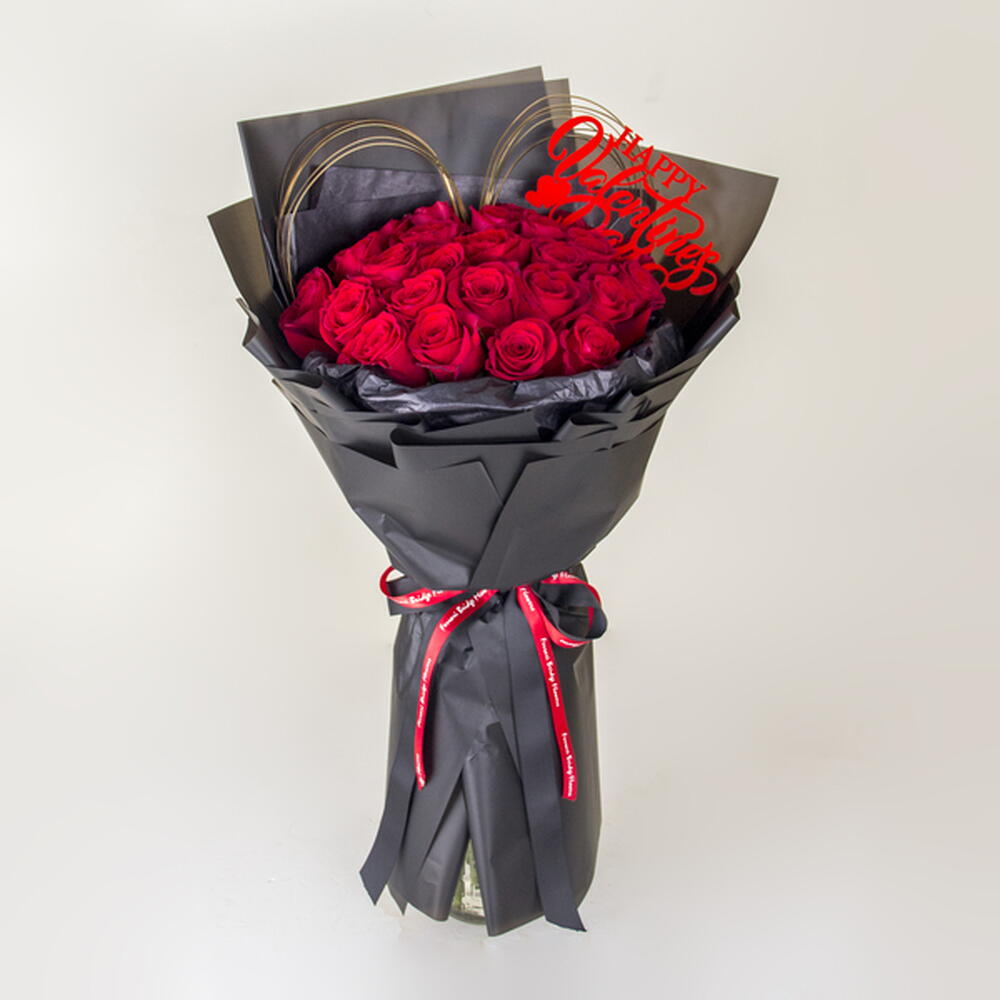 Express your deepest emotions with this passionate bouquet of red roses, a symbol of intense love and affection. The Happy Valentines topper and a gold heart add a touch of magic to this unforgettable gift.