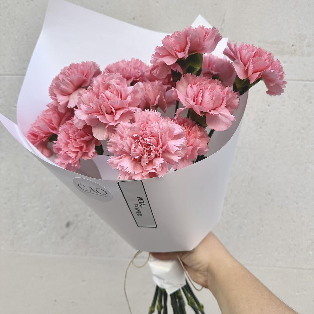 A bouquet of pink carnations that resembles a cloud of cotton candy