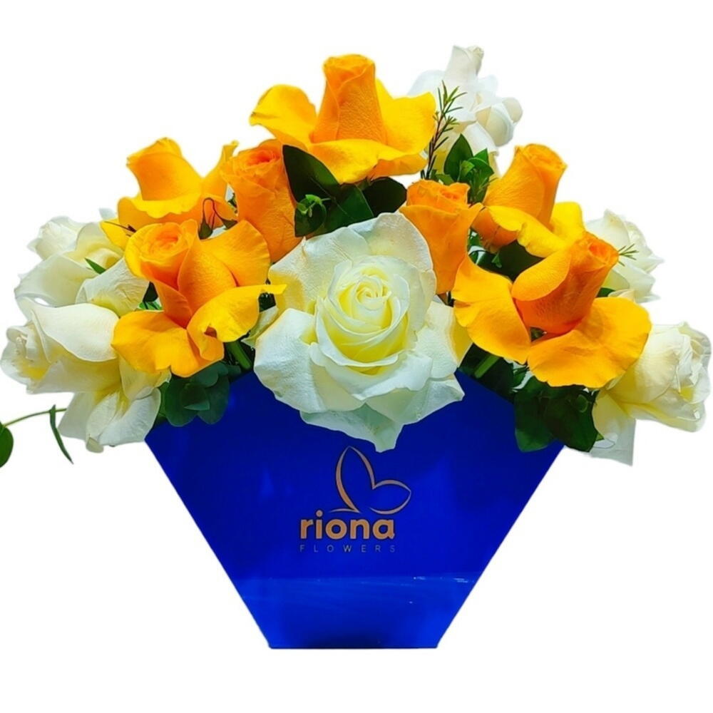 Acrylic Blue box filled with open yellow and white roses