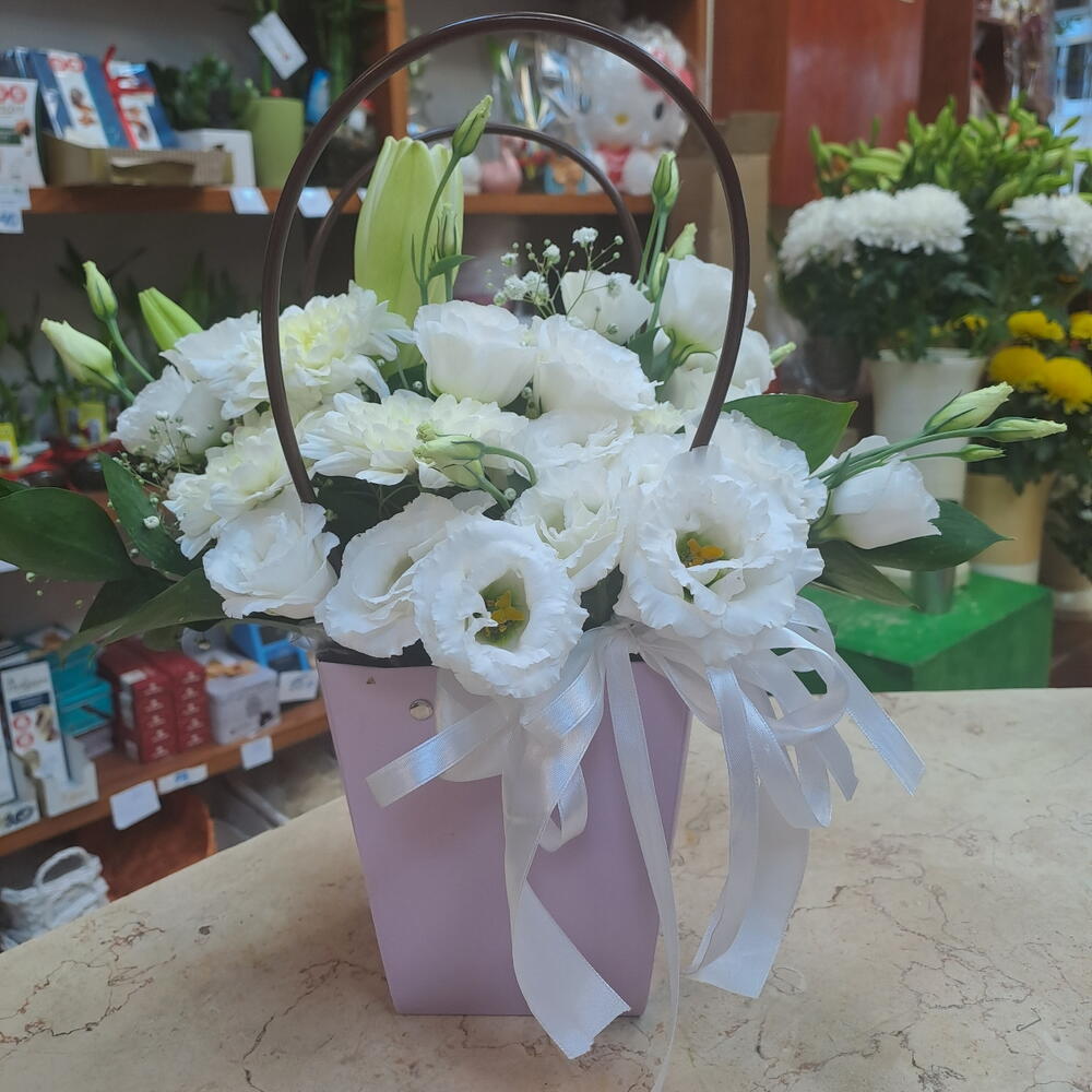 Lily - 2 шт. Handbag - 1 шт. decorative greenery - 5 шт. white eustoma - 3 шт. white gypsophila - 1 шт. bush chrysanthemums - 2 шт.