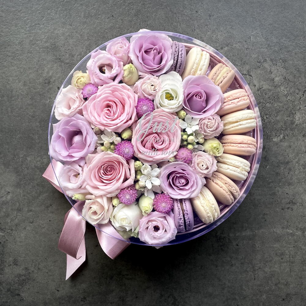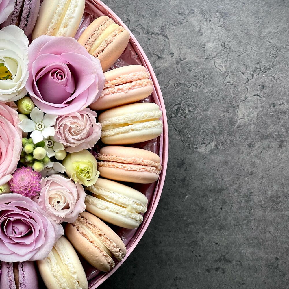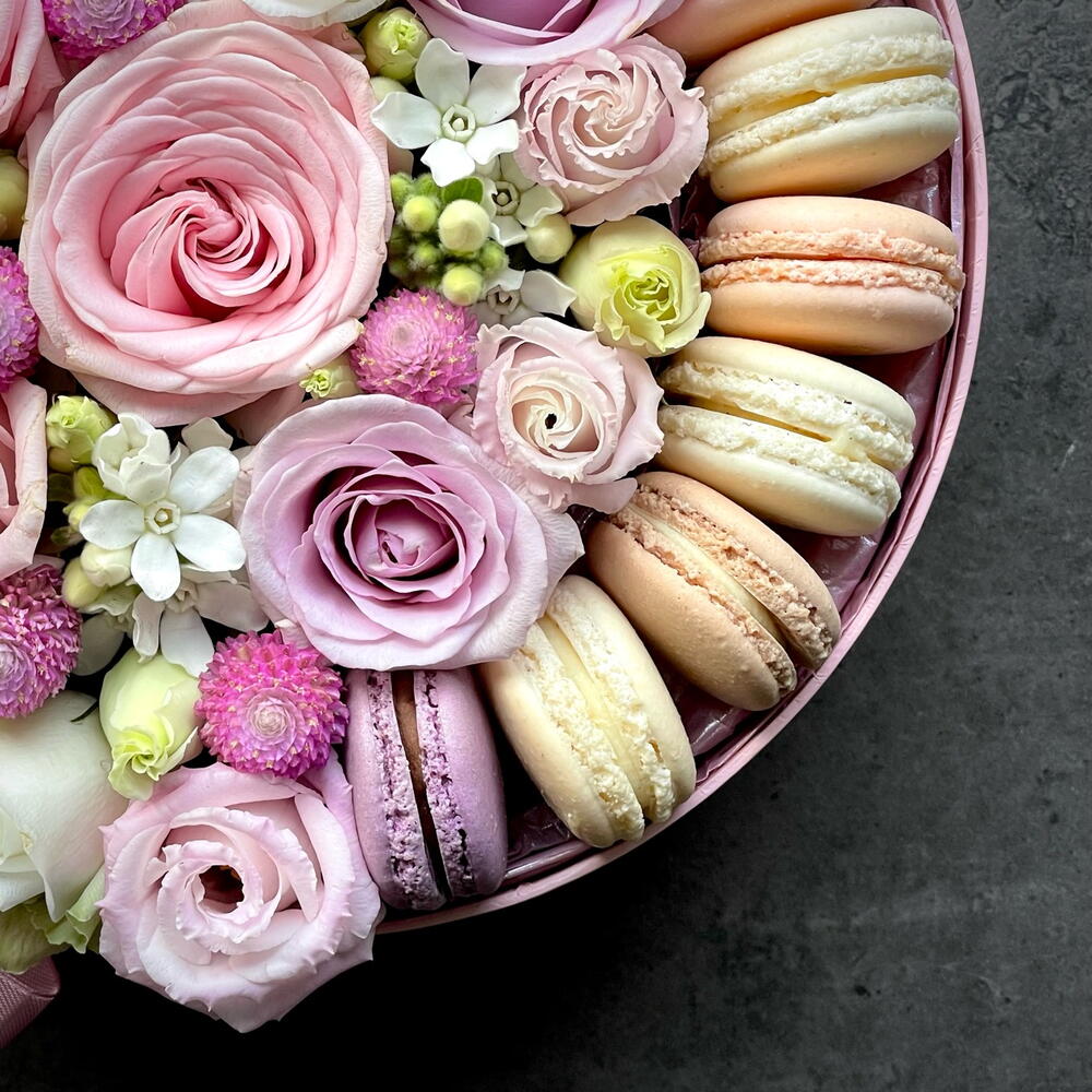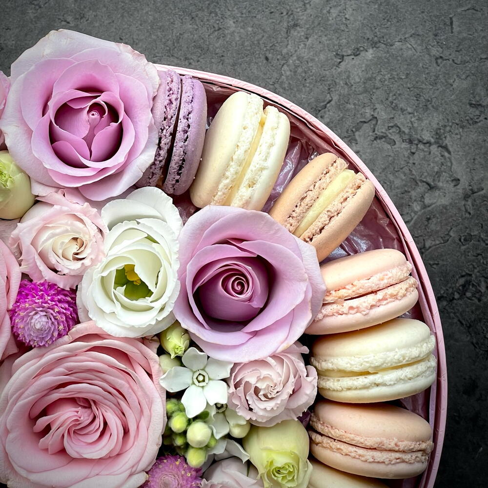 Flowers and macaroons in pink box -size small