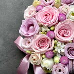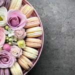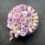 The composition of delicious macaroons, roses, carnations, mini gerberas and lisianthus with the addition of chamelacium flowers is in delicate pastel colours. A festive card is also enclosed.