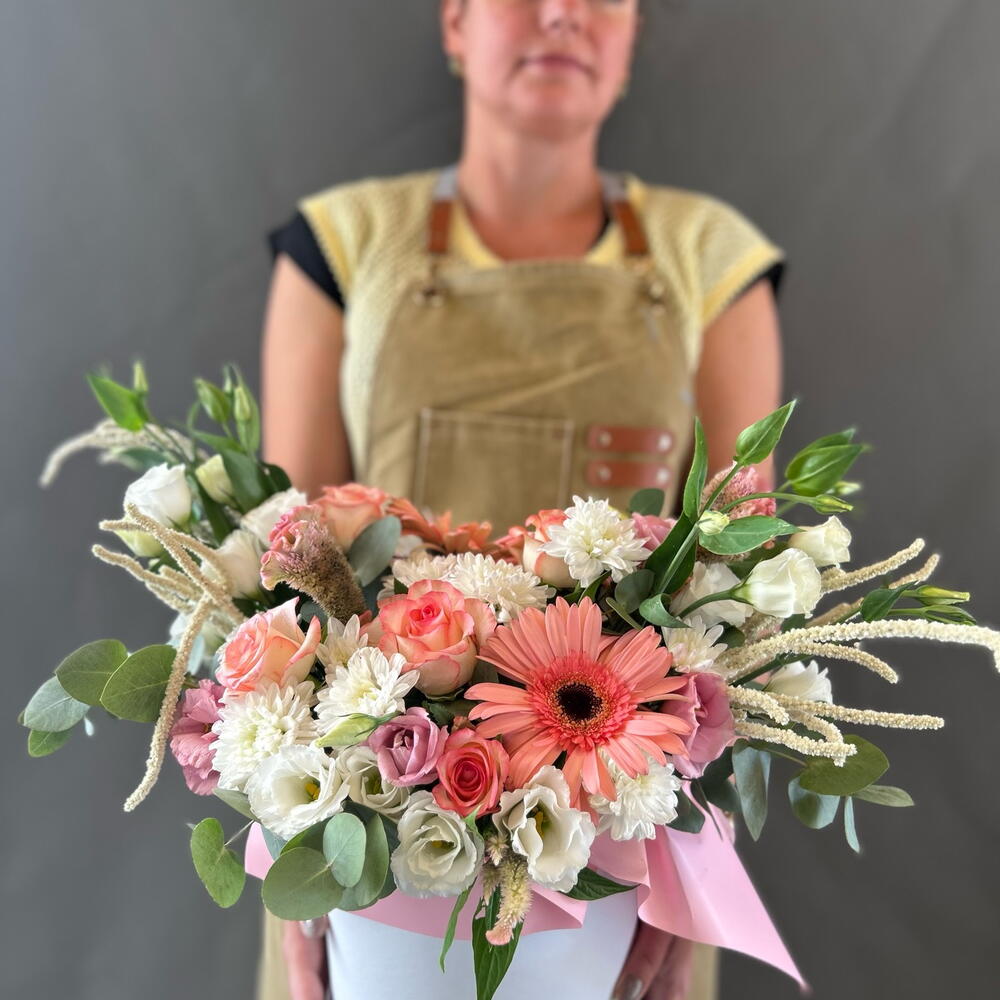 Alstroemeria - 4 шт. Gerbera - 5 шт. chrysanthemum bush - 3 шт. rose - 3 шт. hat box - 1 шт. ornamental greens - 7 шт. eustorma - 5 шт.