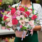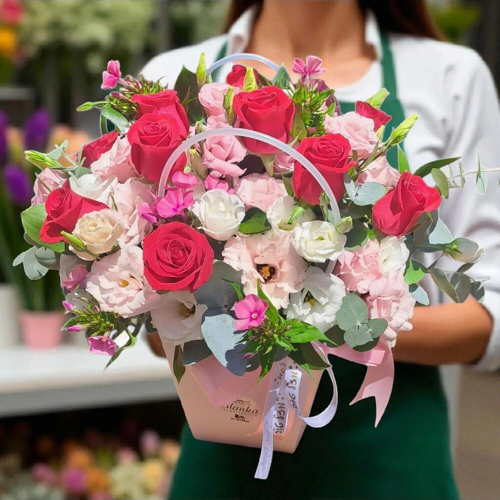 Green leaves - 7 шт. flower box - 1 шт. roses - 9 шт. flox - 5 шт. austoma pink and white - 9 шт.