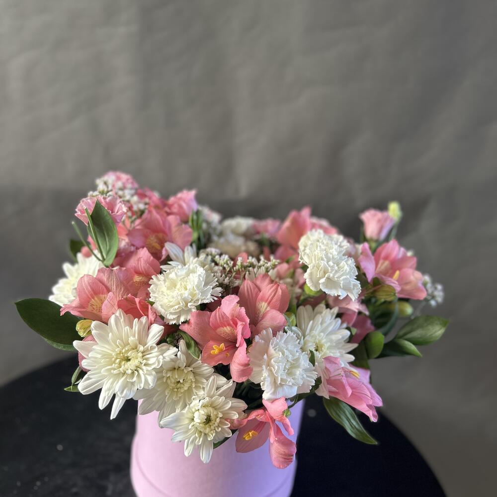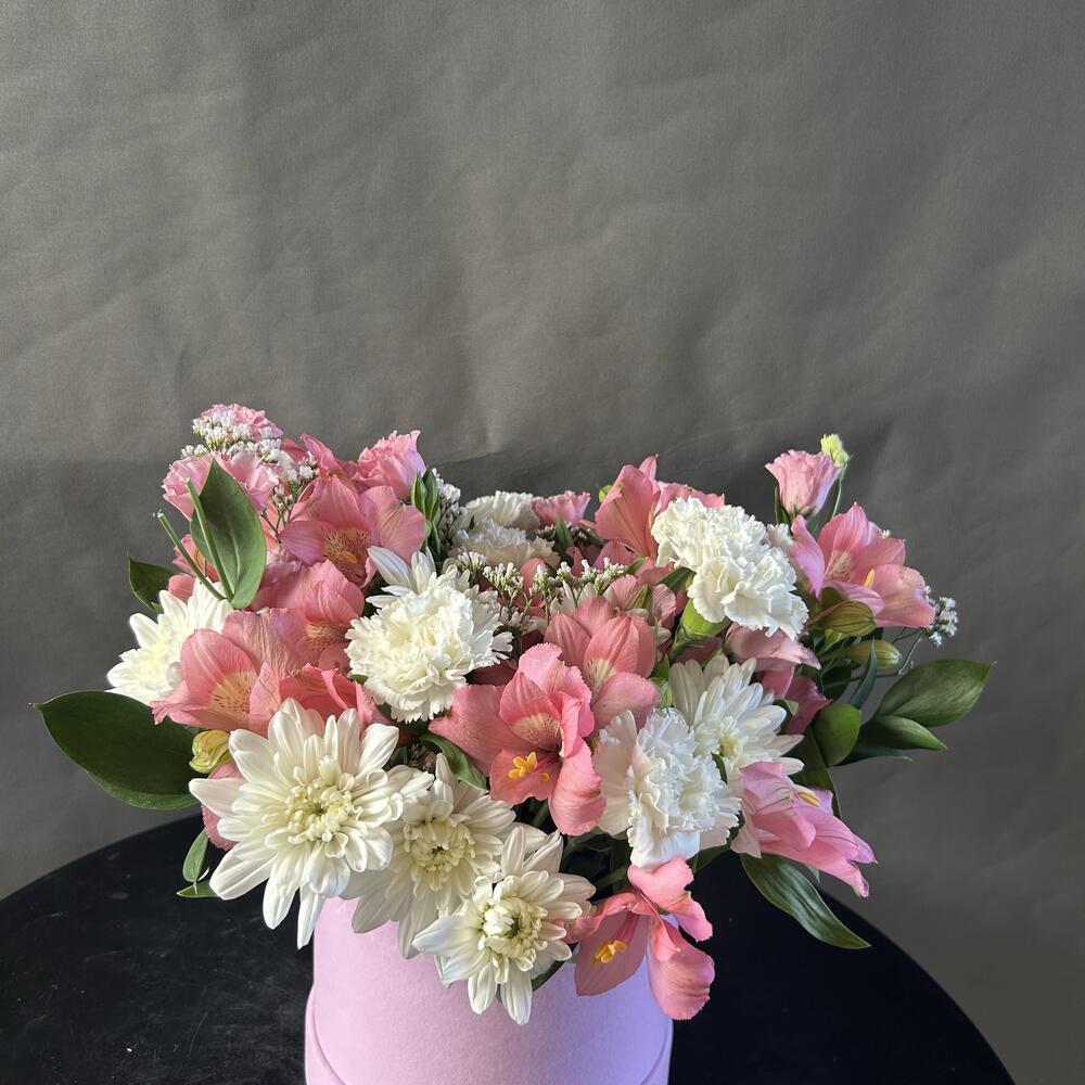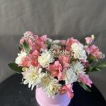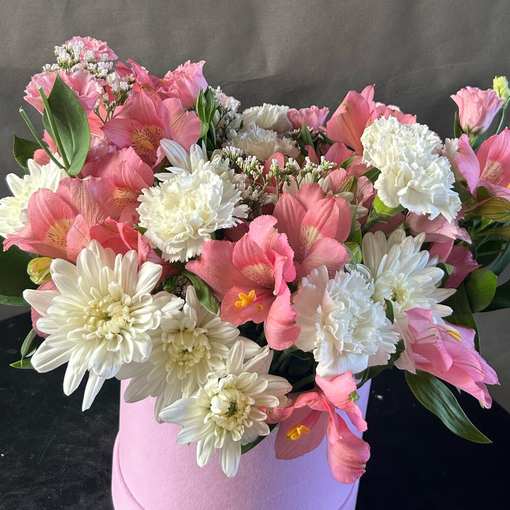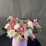 Limonium - 3 шт. Alstroemeria - 7 шт. chrysanthemum bush - 5 шт. box hat - 1 шт. eycalyptus - 4 шт. lithiantus - 4 шт.