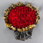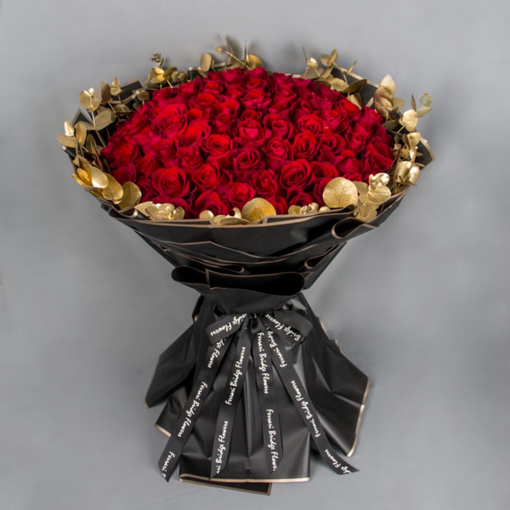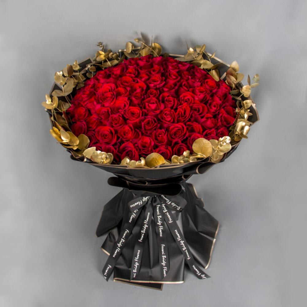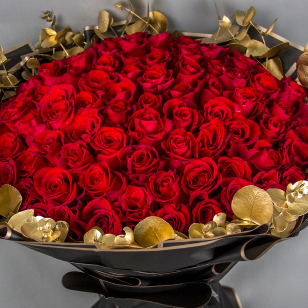 A round bouquet with 100 red Roses and gold Eucalyptus leaves around with black wrapping paper.
