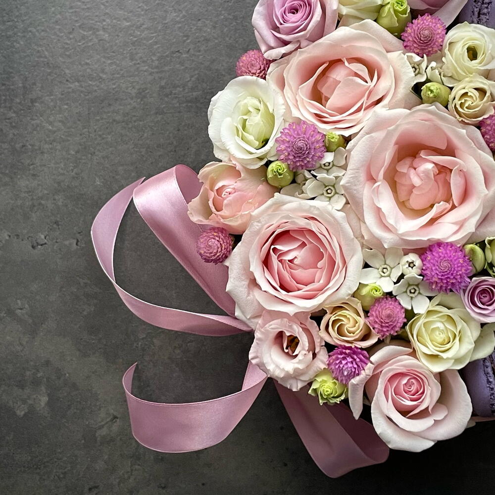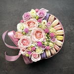 Lisianthus - 12 шт. carnation - 2 шт. postcard - 1 шт. rose mixed - 6 шт. gift bag - 1 шт. carnation mini - 4 шт. round pink box 24 cm - 1 шт. macaroons mix - 11 шт.