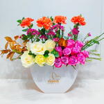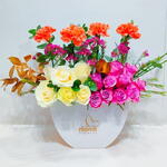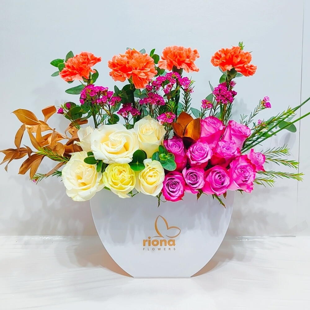 Acrylic box with purple and white roses together with orange carnation, ruscus and eucalyptus leaves