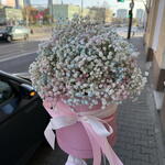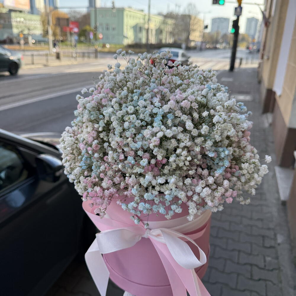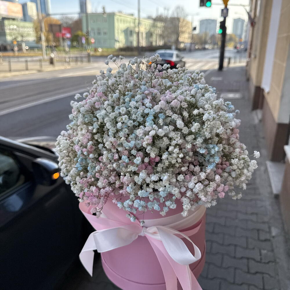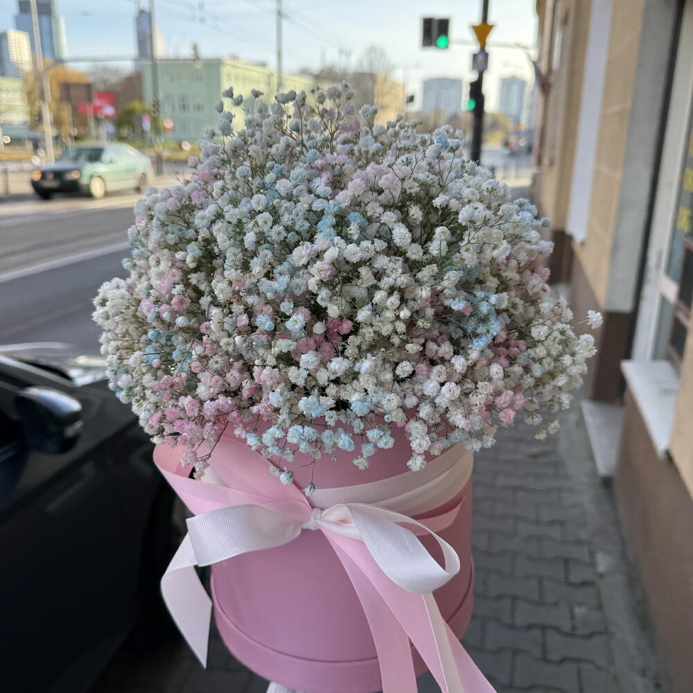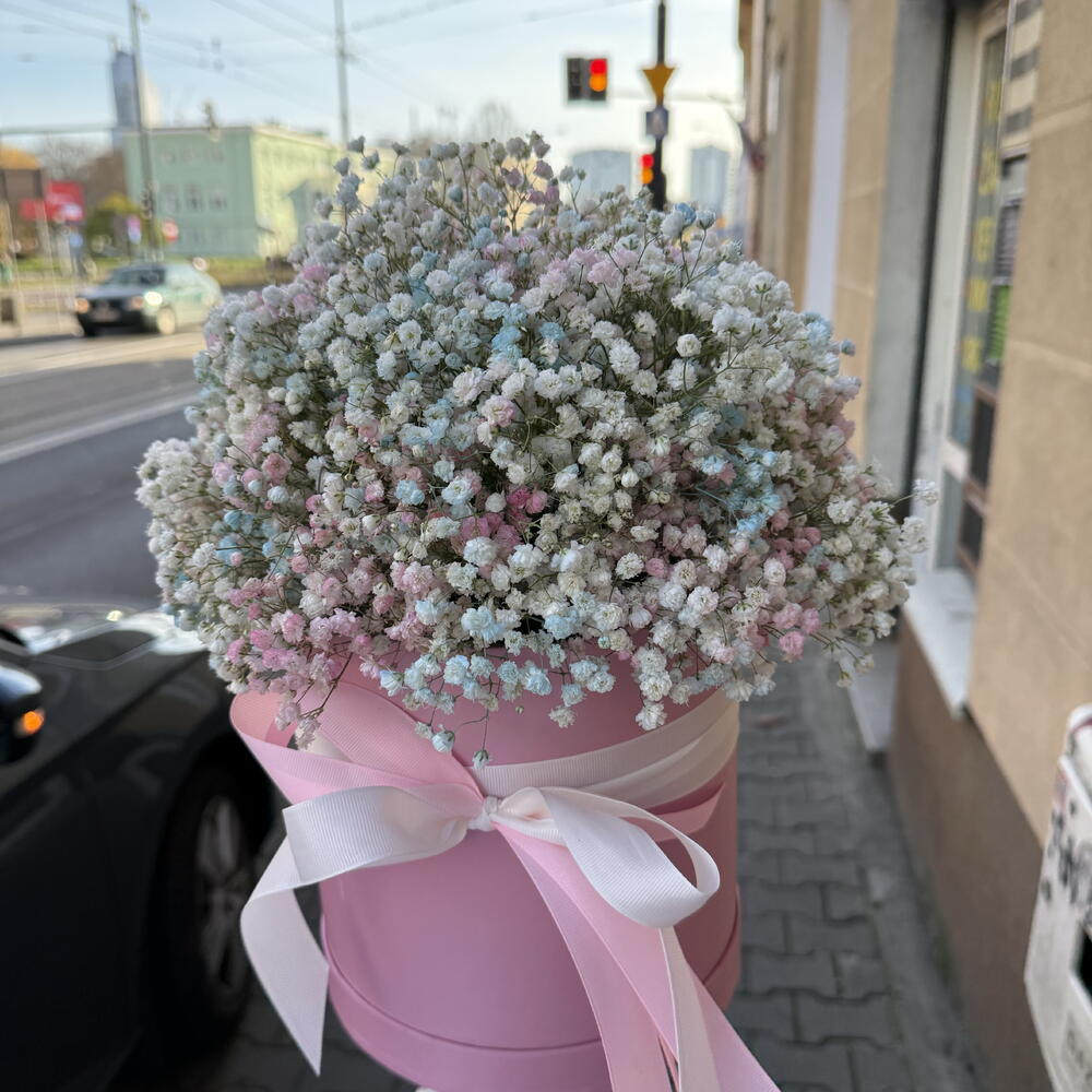 Пастельный бокс с гипсофилой — нежная элегантность для любого случая Прекрасный пастельный бокс в оттенках розового, наполненный нежной гипсофилой, окрашенной в белый, розовый и голубой. Это исключительная композиция, которая поражает своей лёгкостью и романтичным характером. Цветы размещены в элегантной розовой коробке, украшенной атласной лентой, создавая идеальный подарок для близкого человека. Этот милый набор подойдёт в качестве подарка на день рождения, годовщину, Международный женский день, День святого Валентина или просто как милый жест без повода. Нежные оттенки и пушистая форма гипсофилы придают композиции особое очарование, а стильный бокс делает её готовой к вручению сразу после покупки. Идеально, чтобы вызвать улыбку и добавить немного пастельной магии в каждый день.