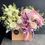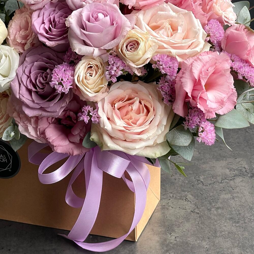 Snapdragon - 3 шт. Limonium - 3 шт. Eucaliptus - 10 шт. Lisianthus - 5 шт. Handbag - 1 шт. postcard - 1 шт. lilly - 1 шт. roses - 7 шт.