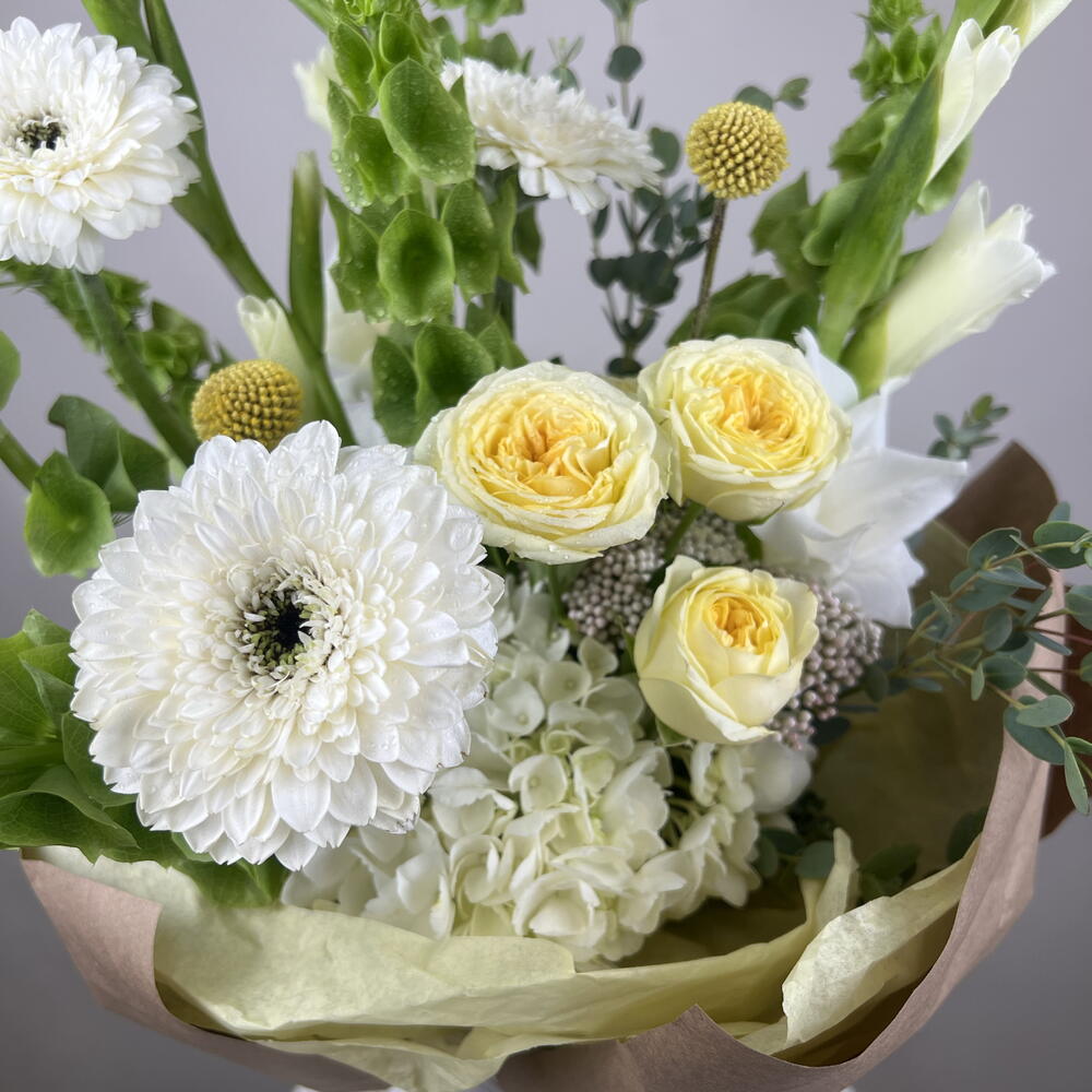 Hydrangea - 1 шт. gerbera mini - 3 шт. crispedia - 3 шт. greenery mix - 1 шт. spray garden roses - 3 шт. irish bells - 6 шт. sword lilies - 3 шт.