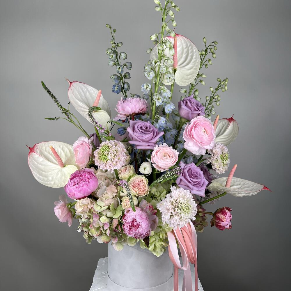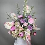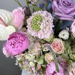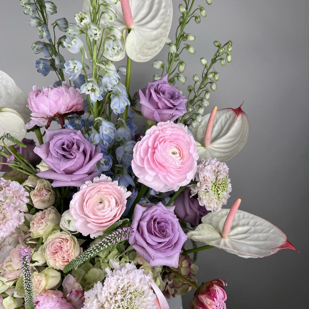 ranunculus - 7 шт. delphinium blue - 5 шт. veronica flower - 8 шт. spray roses - 7 шт. skabiosa - 7 шт. lavender roses - 9 шт. hydrengea mix - 6 шт.