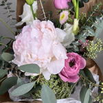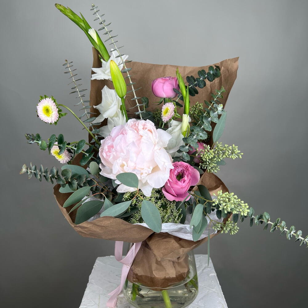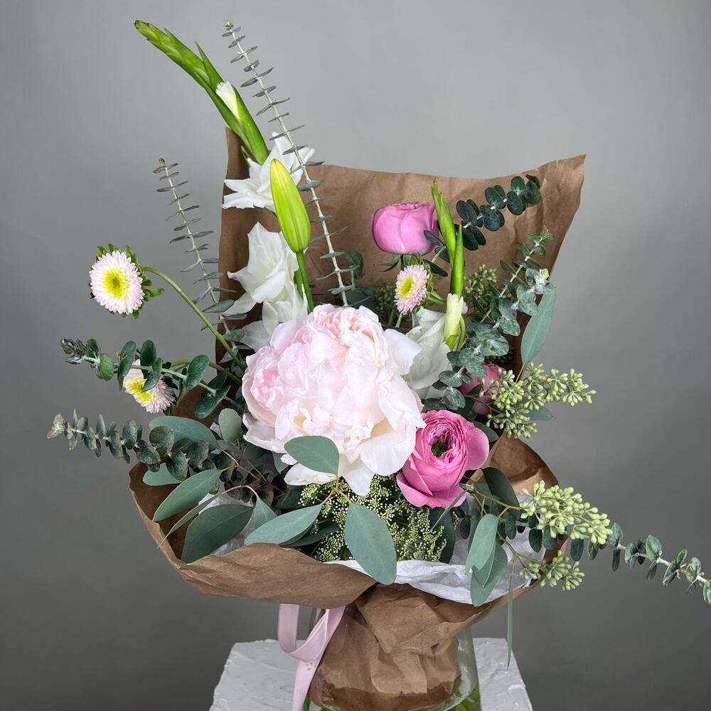 Peonies - 1 шт. lily stem - 1 шт. garden roses - 3 шт. queen lace - 2 шт. mix of greenery - 1 шт.
