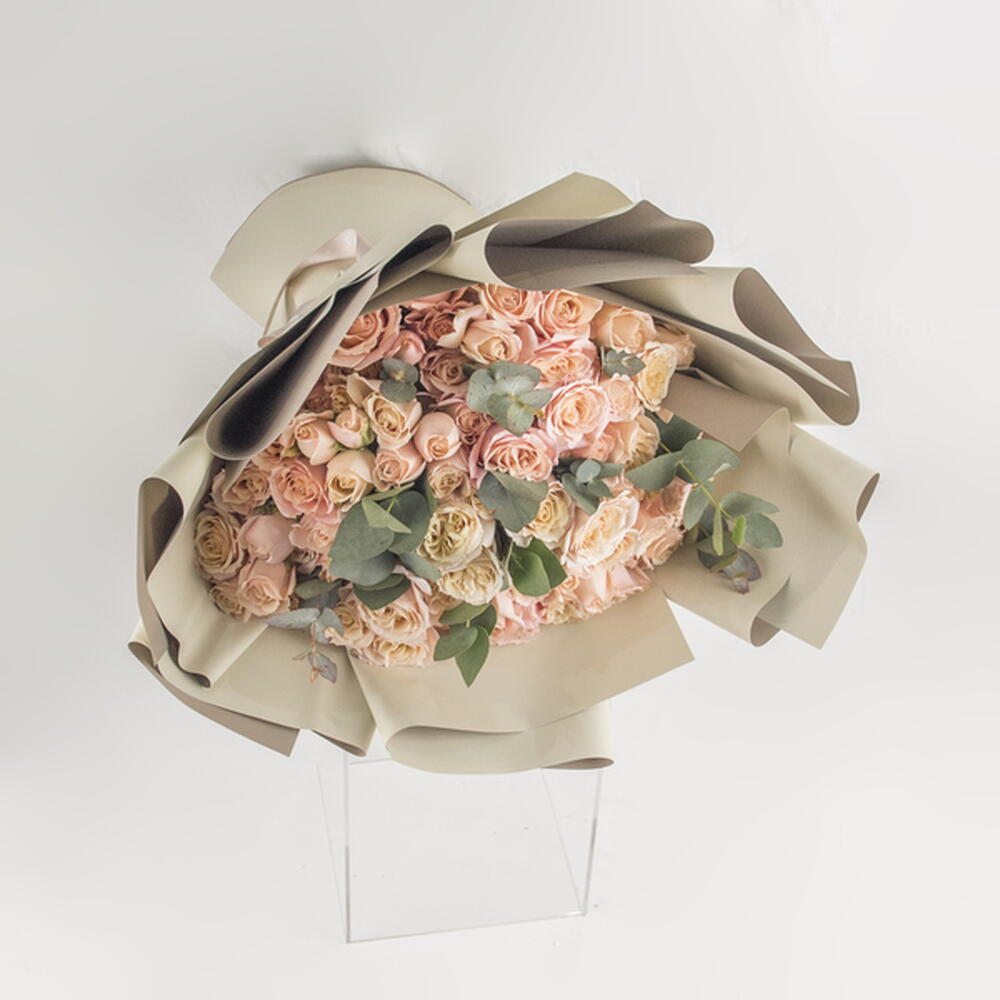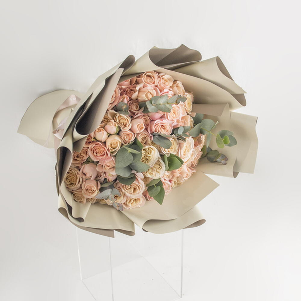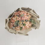 A hand bouquet of peach spray roses with eucalyptus leaves.