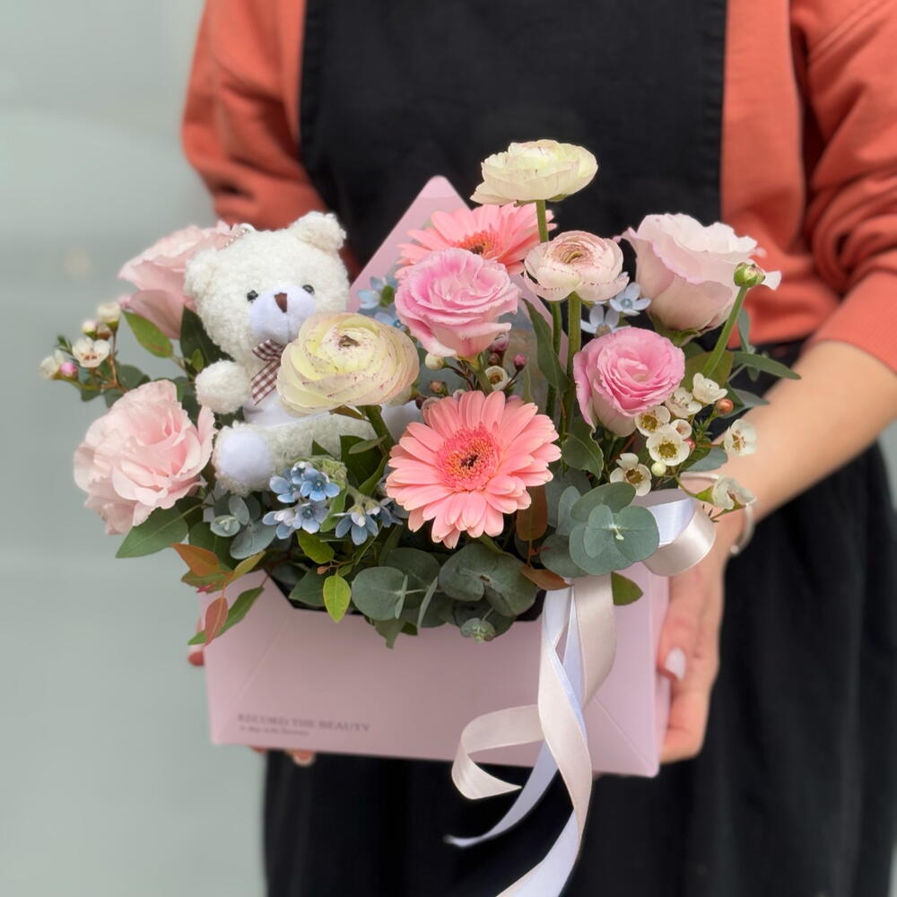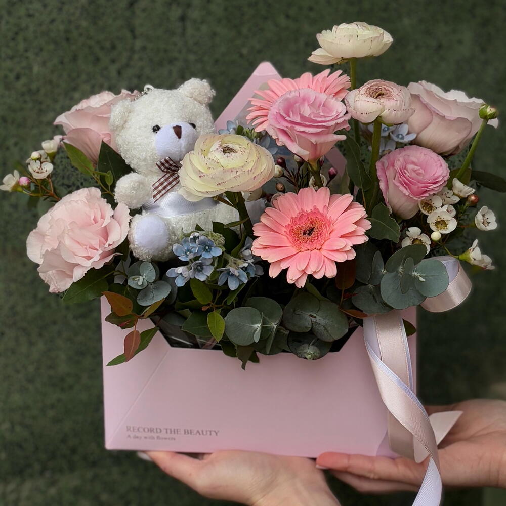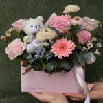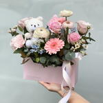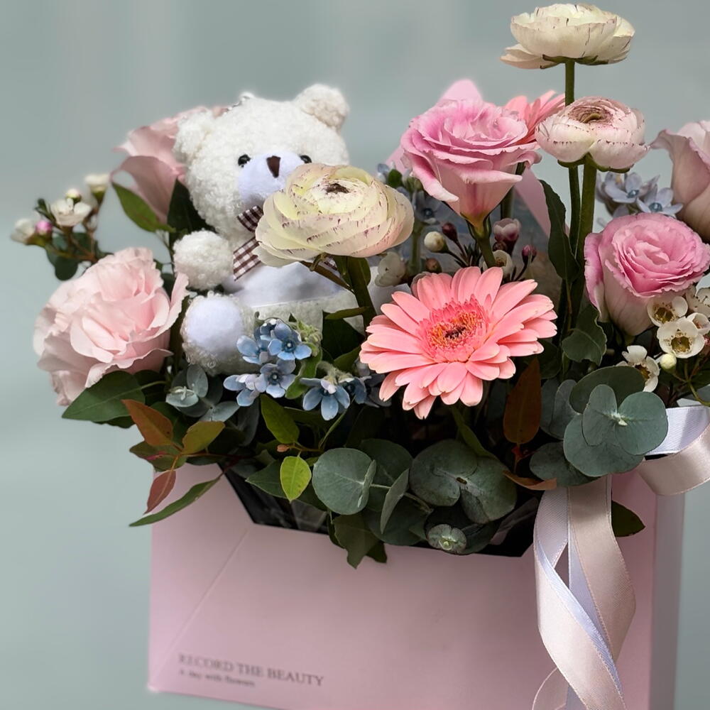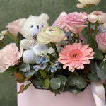 Eustoma - 1 шт. Eucalyptus - 1 шт. Gerbera - 2 шт. Bear - 1 шт. ranunculus - 3 шт.