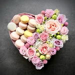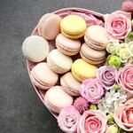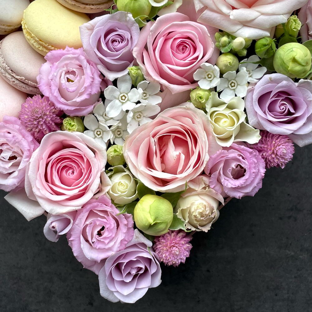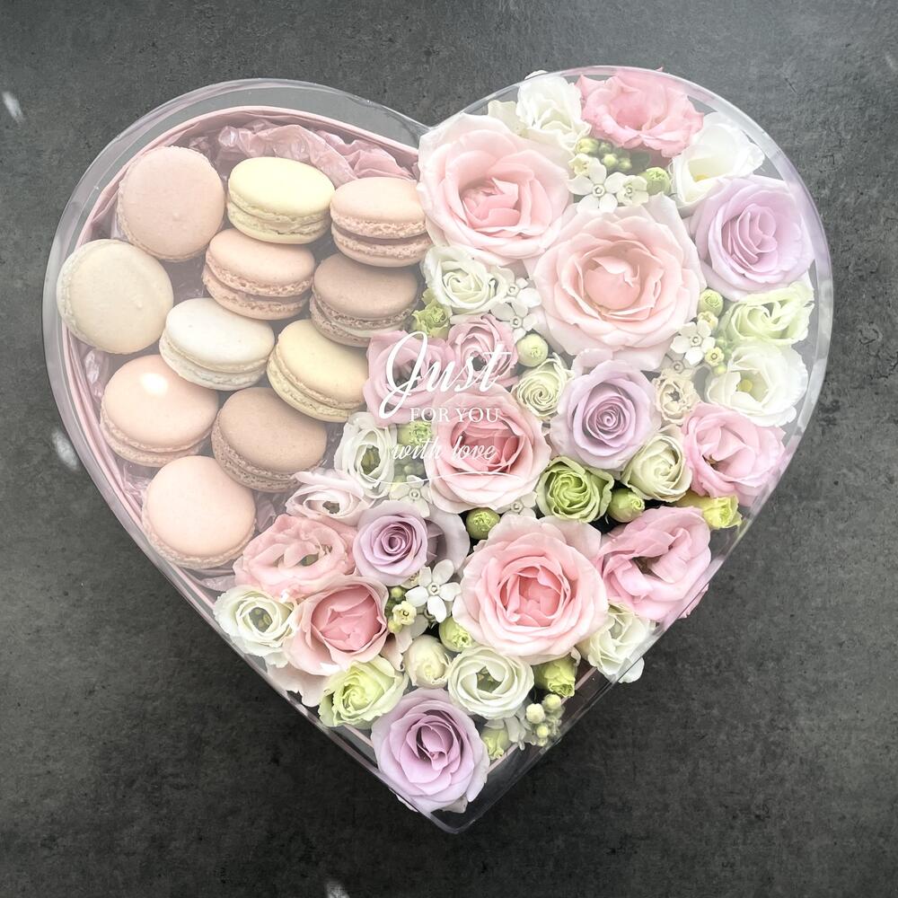 A heart-shaped box with flowers and your favorite macarons! 🥰💕