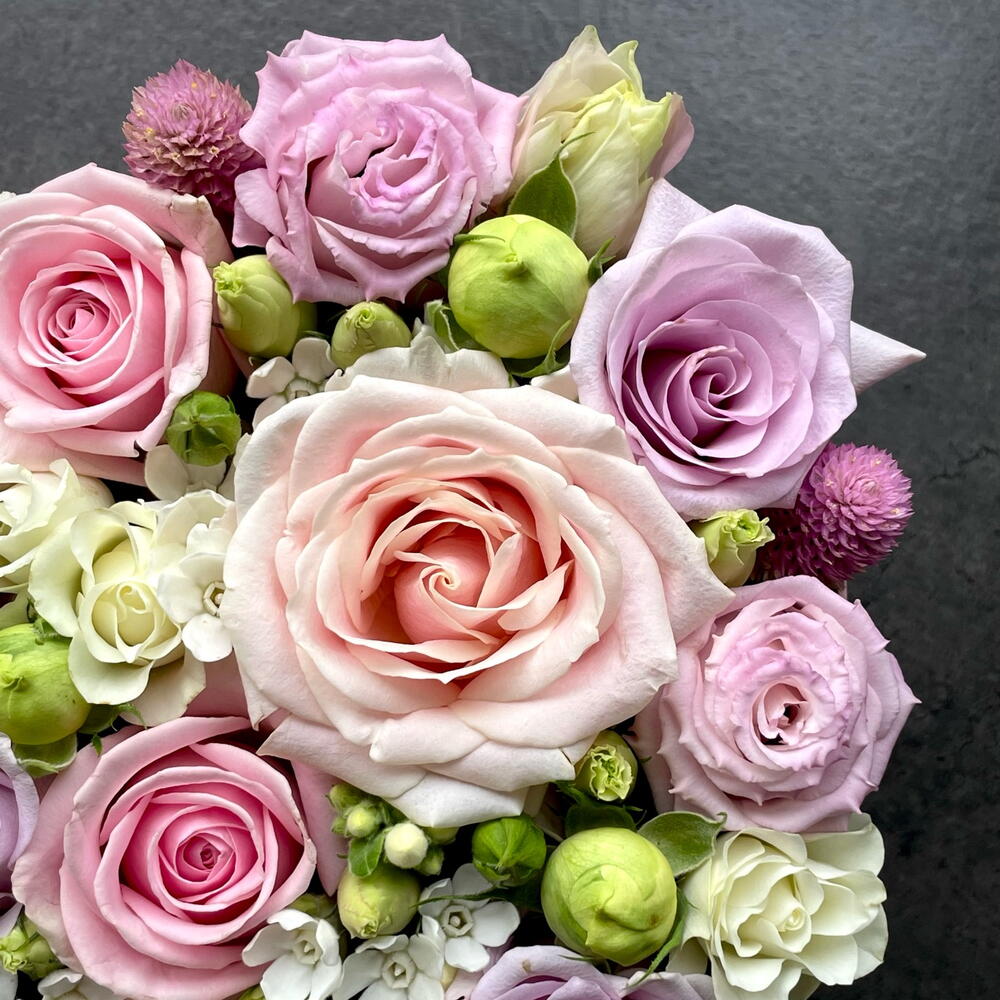 Lisianthus - 4 шт. rose pink - 5 шт. macaroons - 11 шт. postcard - 1 шт. bush rose - 3 шт. twidia - 2 шт.