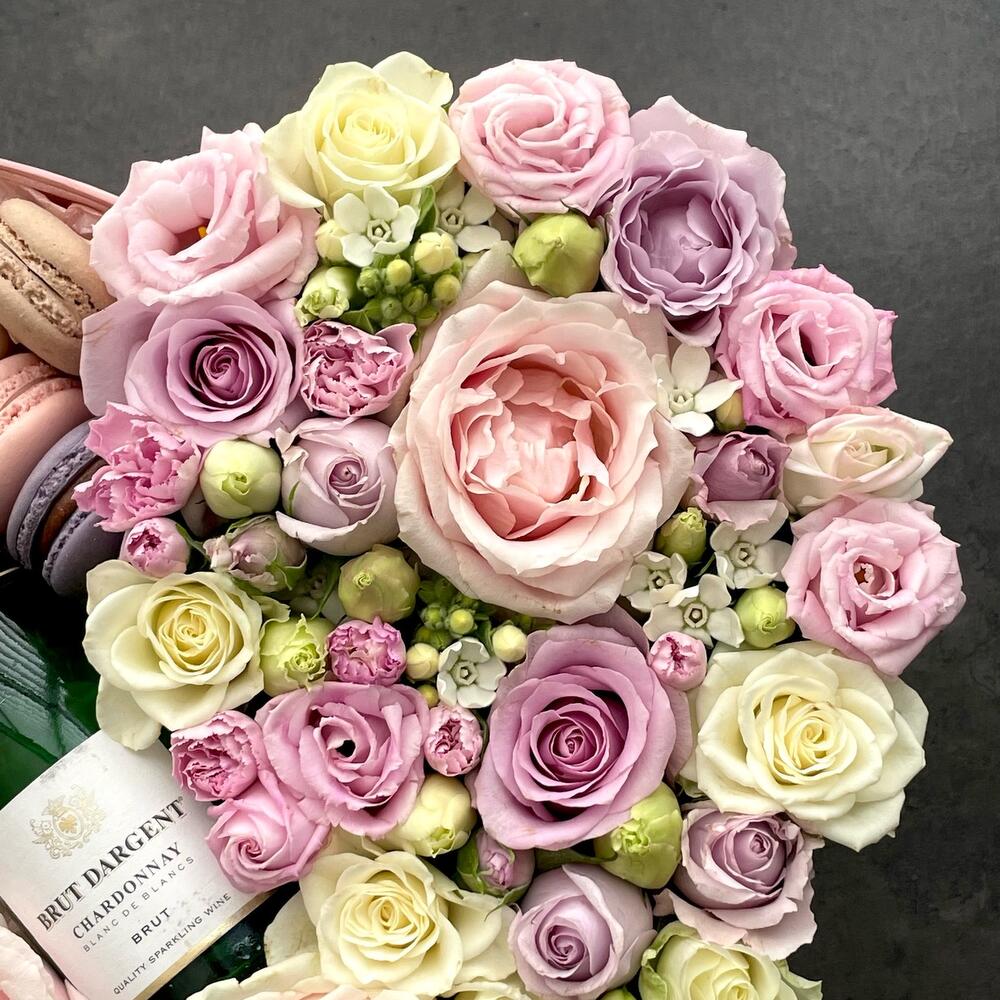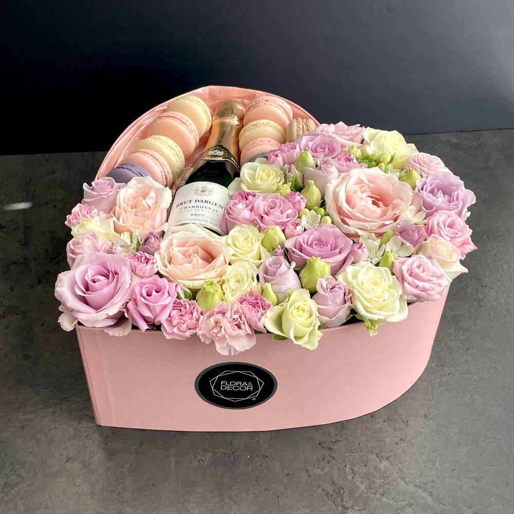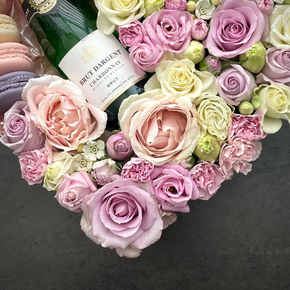 flower mix - 23 шт. champagne 200 ml - 200 мл macaroon set - 10 шт. box 29 cm - 1 шт. cards with wishes - 1 шт.
