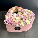 The set consists of macaroon biscuits, a bottle of French sparkling brut (200ml) and fresh flowers in delicate pastel colours: lisianthus, carnations, mini roses and gerberas, buttercups and chamelaciums Additional sizes and options available. Large (box length 32cm) - 350 with a large bottle of Martini Asti sparkling wine.