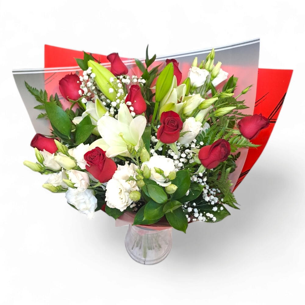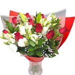 lily white - 3 шт. lysianthus white - 5 шт. red roses 50 cm - 9 шт. ornamental greens - 10 шт. pack - 1 шт.