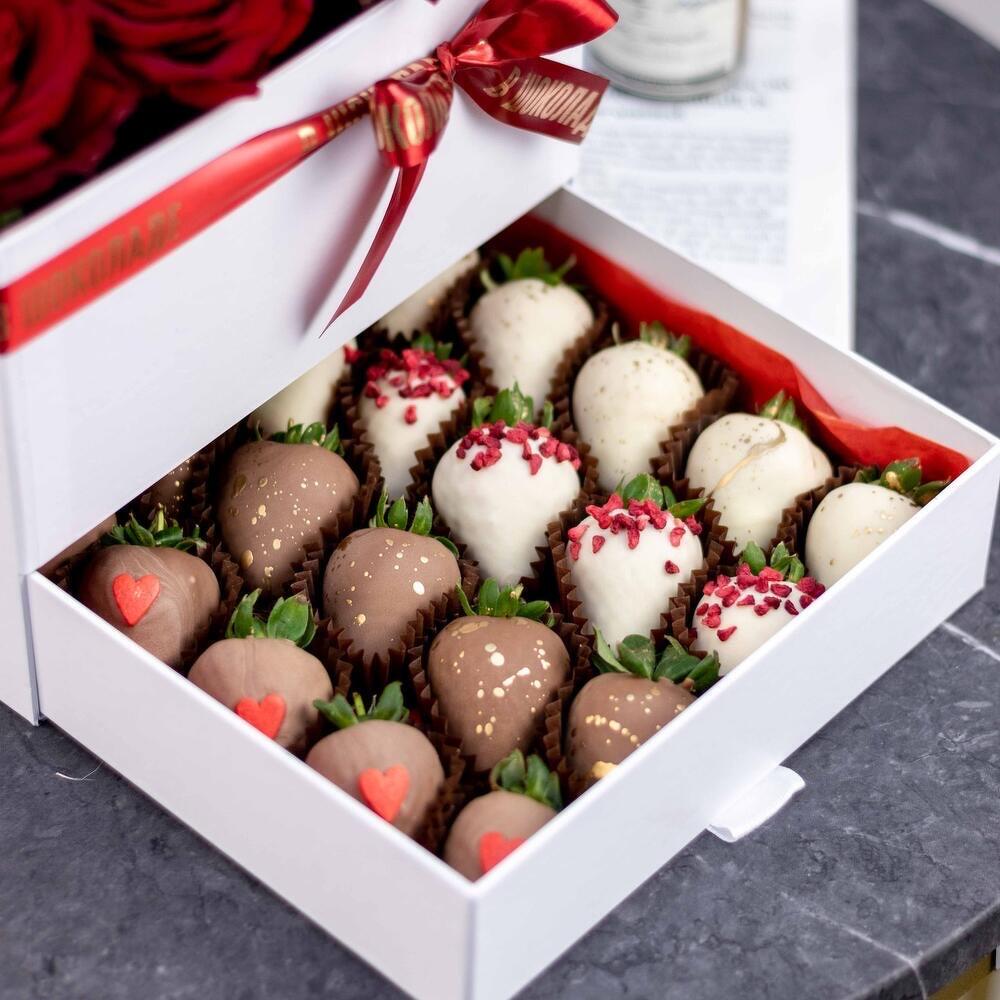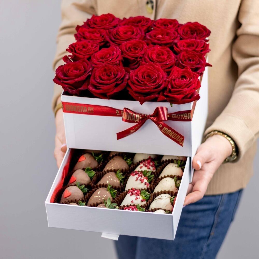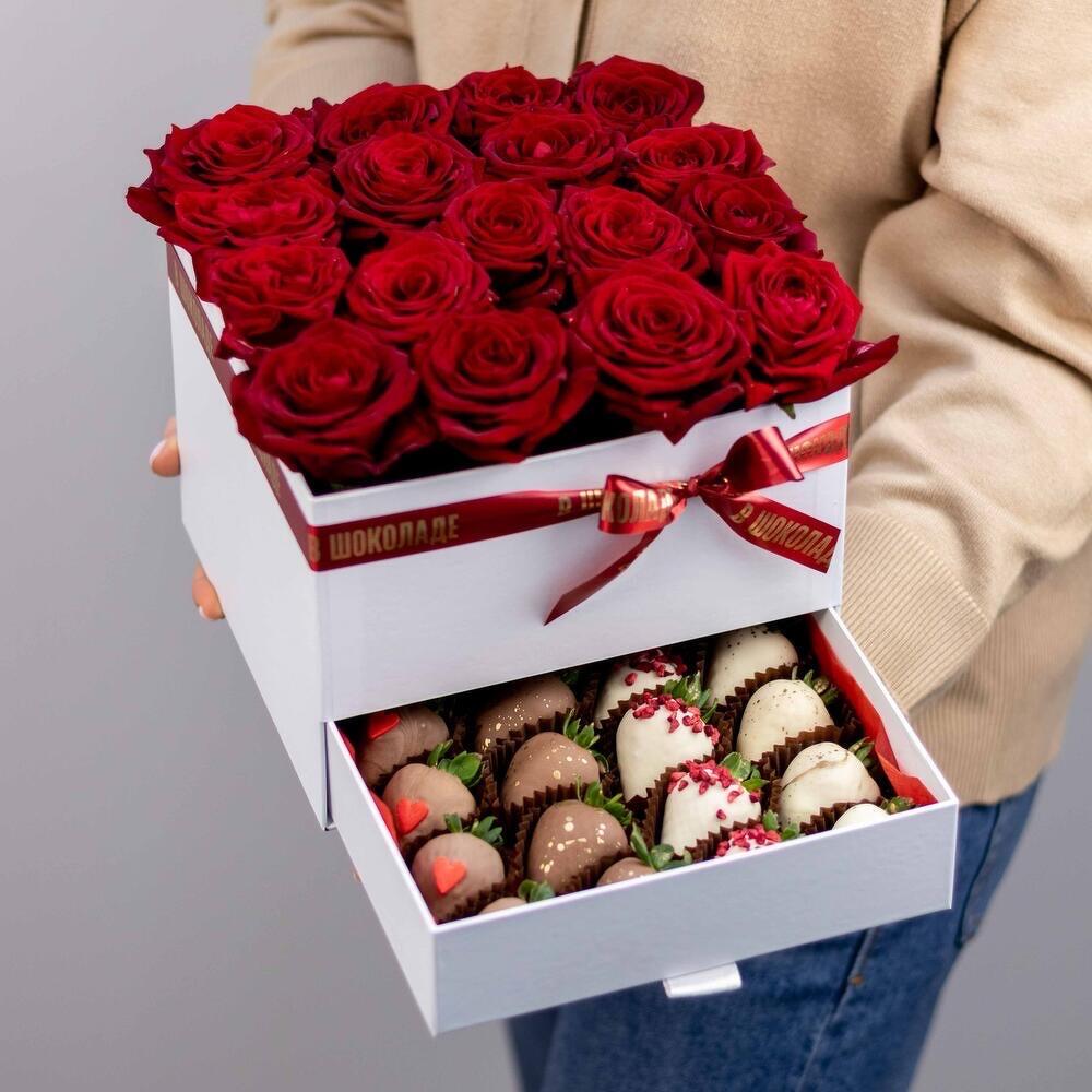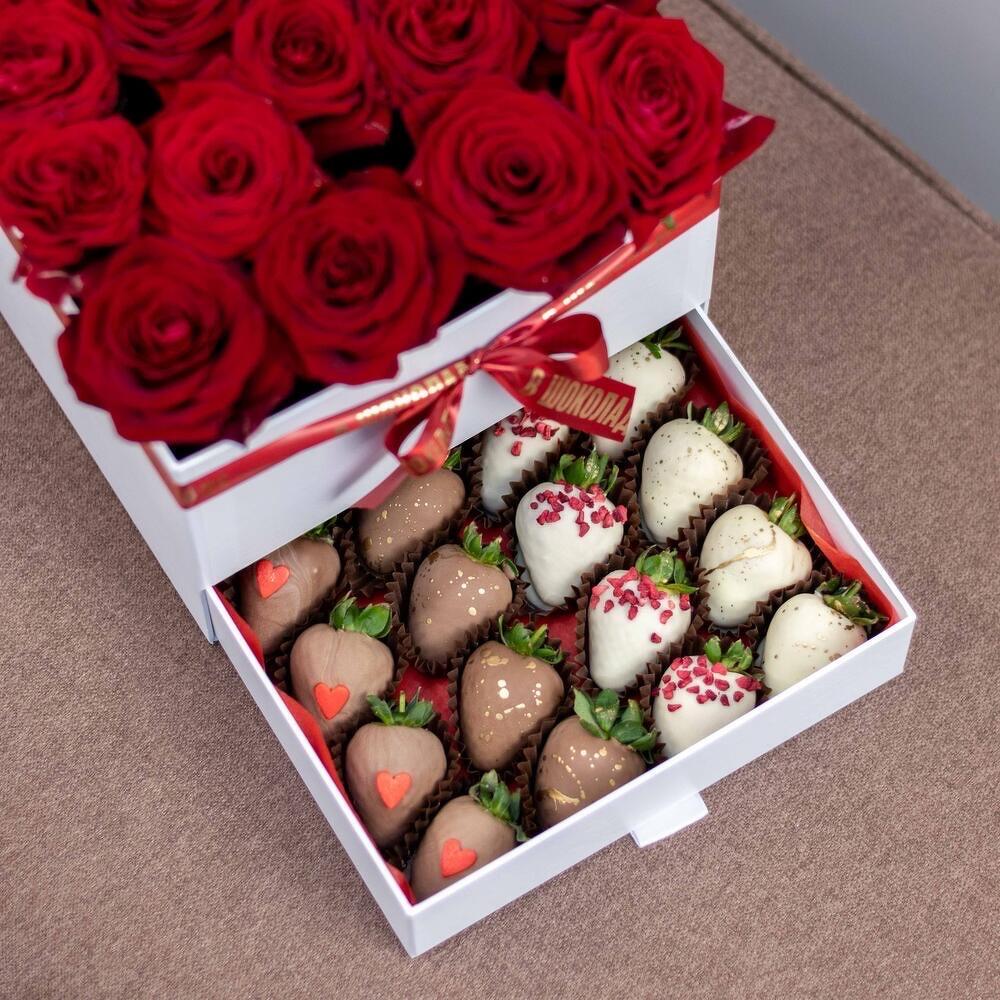 Роскошная подарочная коробка, наполненная самыми искренними чувствами: бархатистые алые розы символизируют страсть и любовь, а нежные клубники в шоколаде — сладкие моменты вместе. В верхнем отделении — букет из свежих красных роз, в нижнем — 16 сочных клубничек в молочном, белом и тёмном шоколаде, украшенных орешками, ягодами и глазурью. Идеальный подарок для любимого человека на День рождения, 14 февраля или просто без повода — чтобы сказать: «Ты — моя сладкая радость».