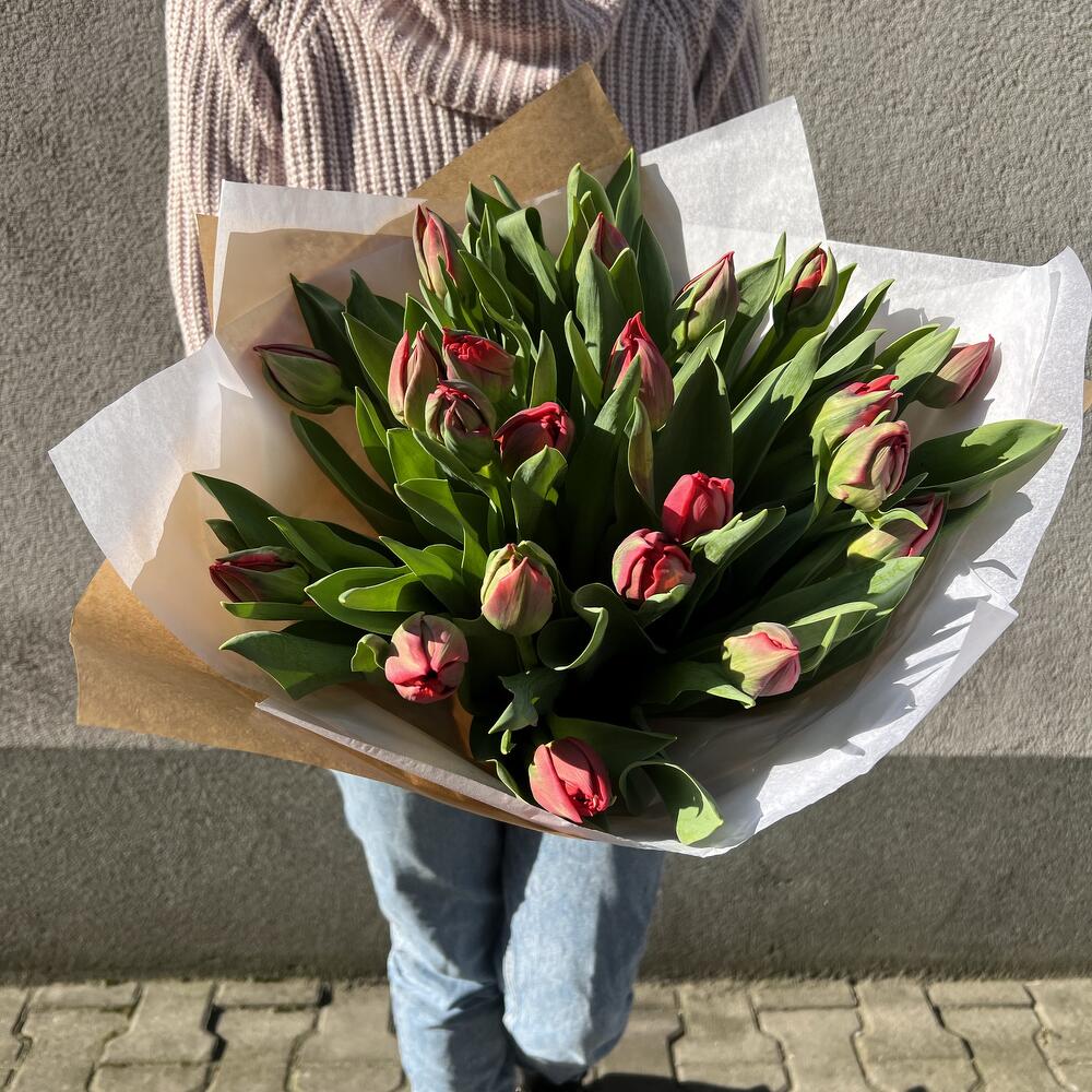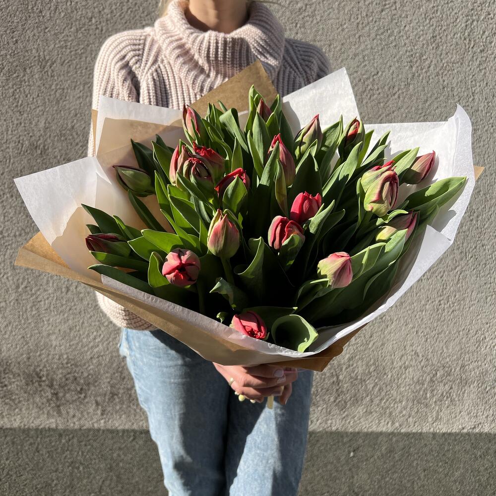 красные тюльпаны - 21 шт. лента - 1 шт. бумага тишью - 2 шт. крафт-бумага - 1 шт.