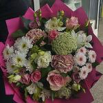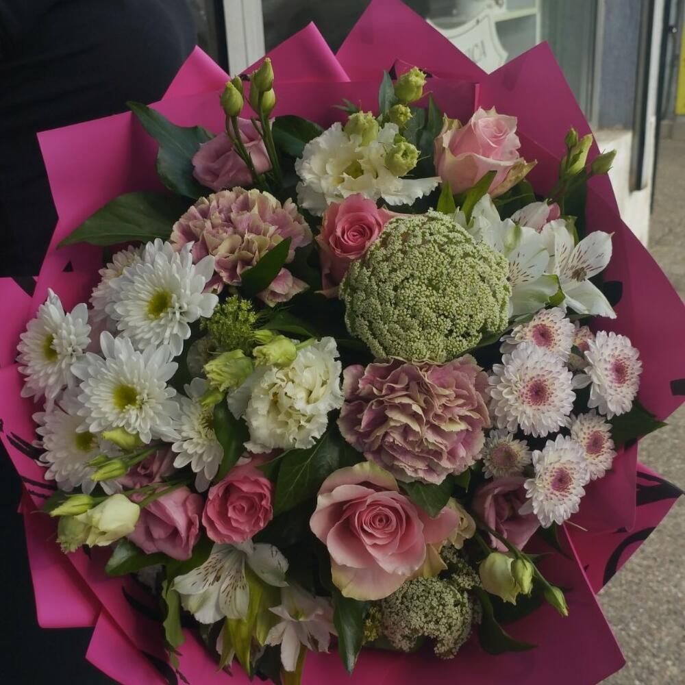Greenery - 5 шт. Chrysanthemum - 3 шт. Alstroemeria - 2 шт. Lisianthus - 3 шт. dianthus - 2 шт. ammi - 2 шт. упаковка - 1 шт. roses - 2 шт.