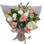 decorative greens - 5 шт. white gypsophila - 2 шт. rose pink 50 cm - 9 шт. lysianthus white - 4 шт.