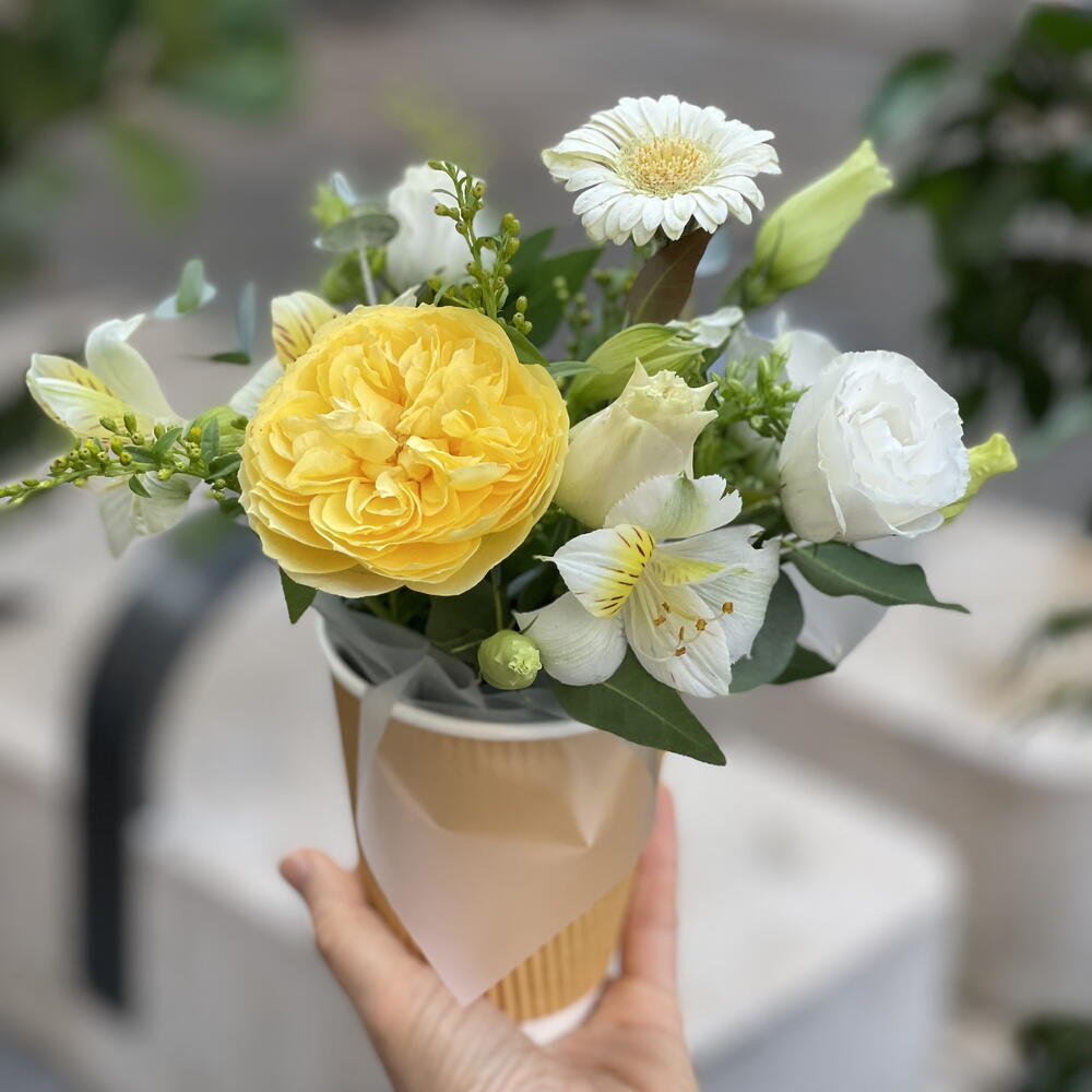 Мини-букет в стаканчике — идеальное сочетание простоты и очарования! Нежные розы, гербера и белоснежные бутоны в обрамлении эвкалипта создают лёгкое утреннее настроение, словно чашка кофе с солнечным привкусом. Цветы не имеют сильного аромата и подойдут даже для рабочего стола или прикроватной тумбы. Композиция устойчива и не требует особого ухода — просто добавляйте немного воды каждые пару дней, и она будет радовать вас свежестью до недели.