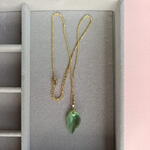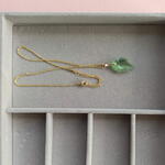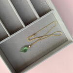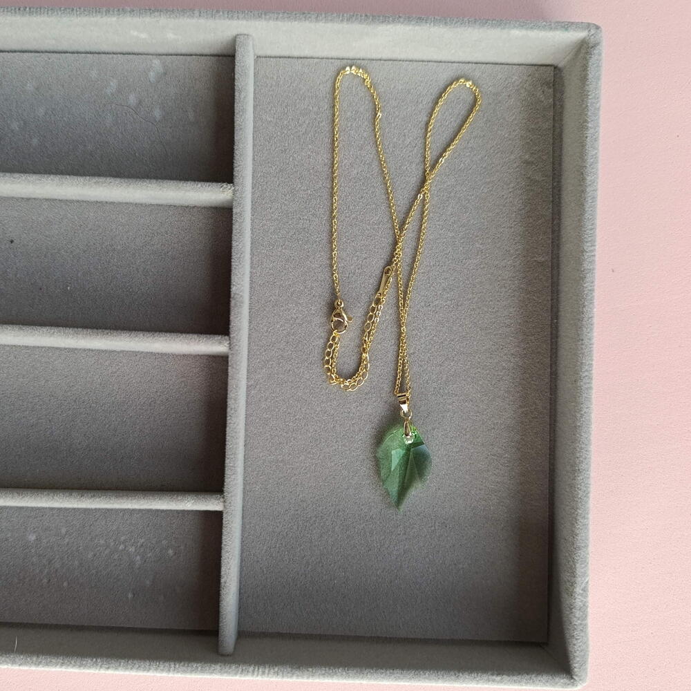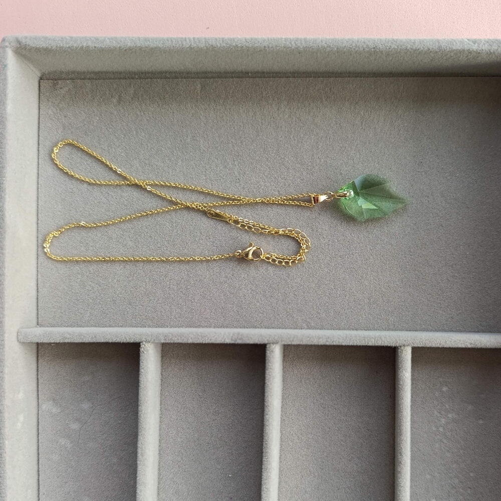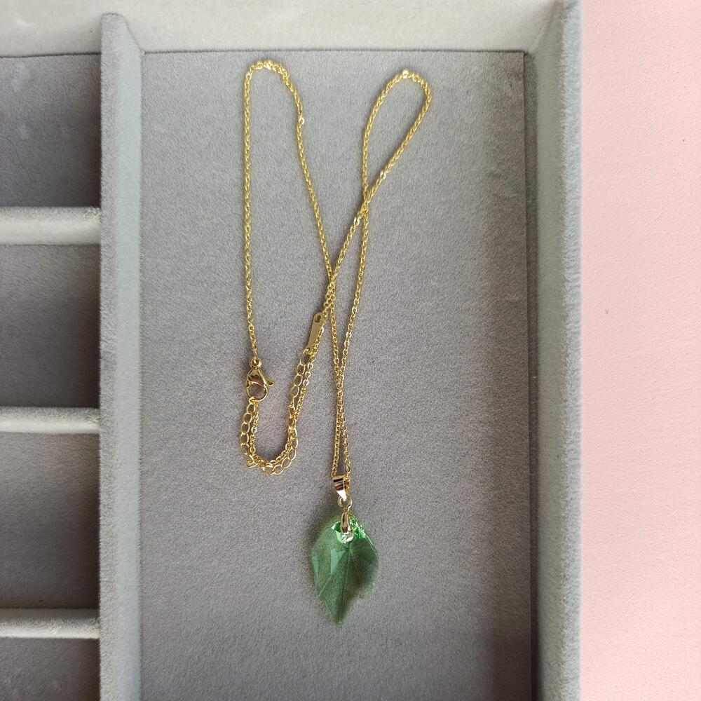 A delicate gold-tone chain with a protective coating, featuring a Swarovski crystal leaf pendant in a soft, gentle green shade. Elegant, lightweight, and perfect for adding a touch of natural sparkle to everyday or evening looks. ✨🍃 The chain length is 45 cm, the leaflets are 2.5 cm long and 1.5 cm wide. Available gift box 🎁.