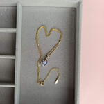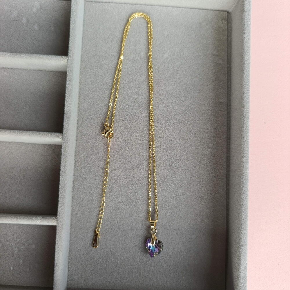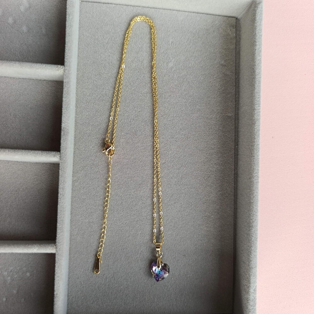 A delicate gold-tone chain with a protective coating, featuring a Swarovski crystal heart pendant in a soft, gentle violen shade. Elegant and lightweight, it adds a romantic touch of natural sparkle to both everyday and evening looks. ✨💚 The chain length is 45 cm. The heart pendant measures approximately 1 cm in height and 1cm in width. Available in a gift box 🎁.
