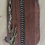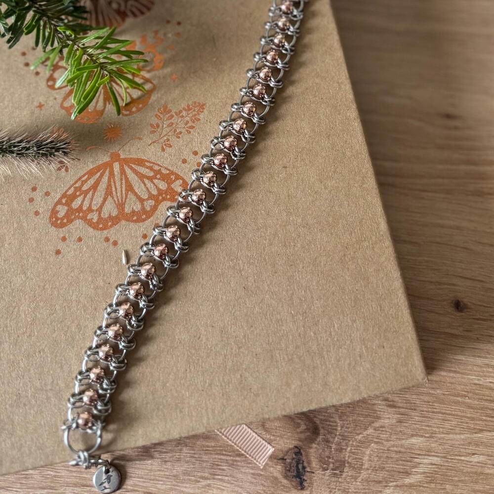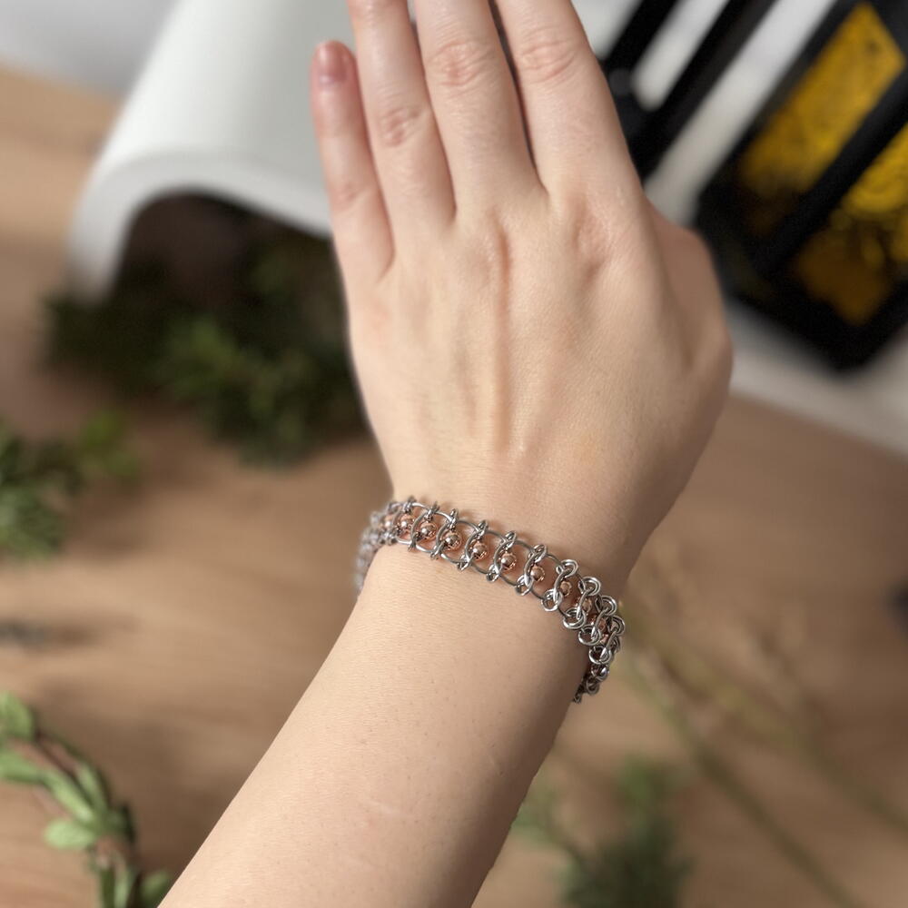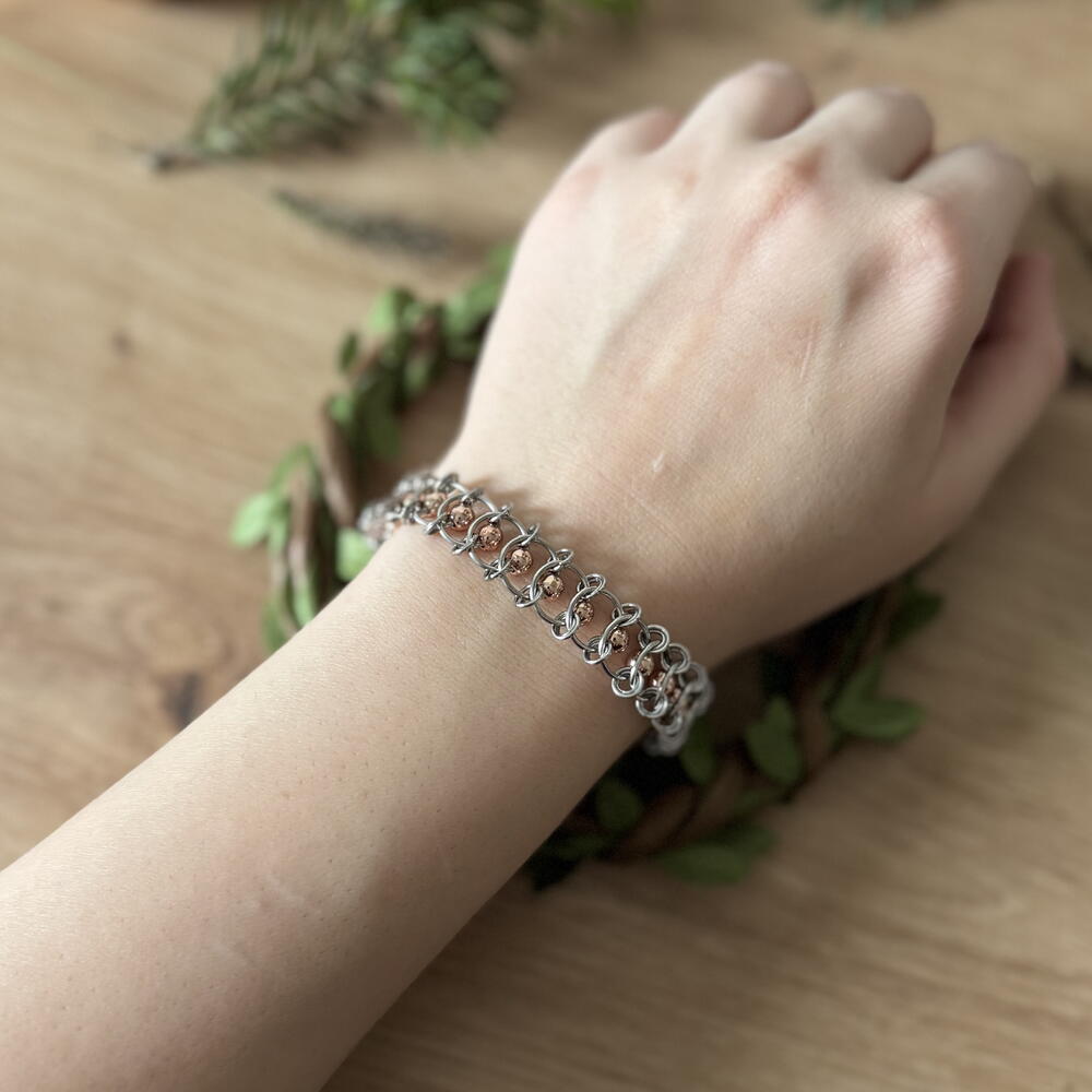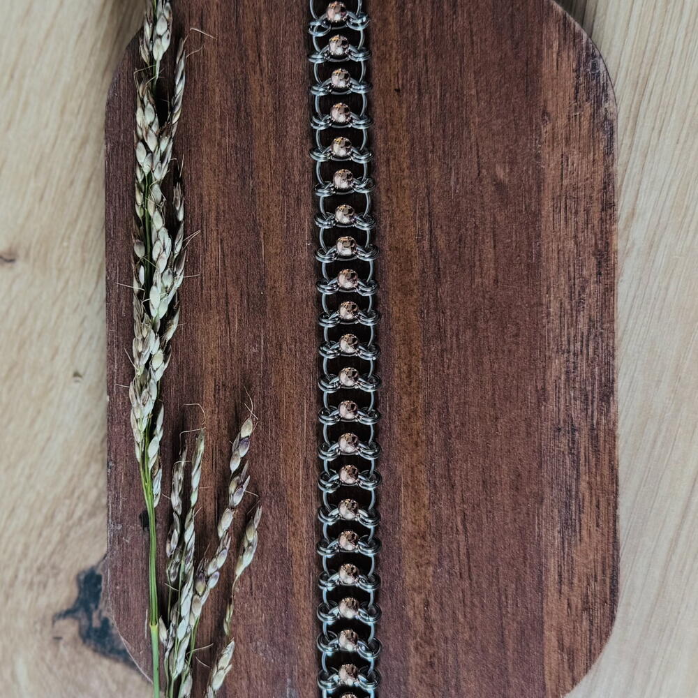 Наруквица од нерђајућег челика са златним хематитним перлама. Златна змија светлуца на сунцу.