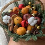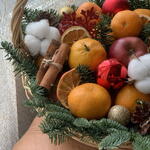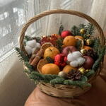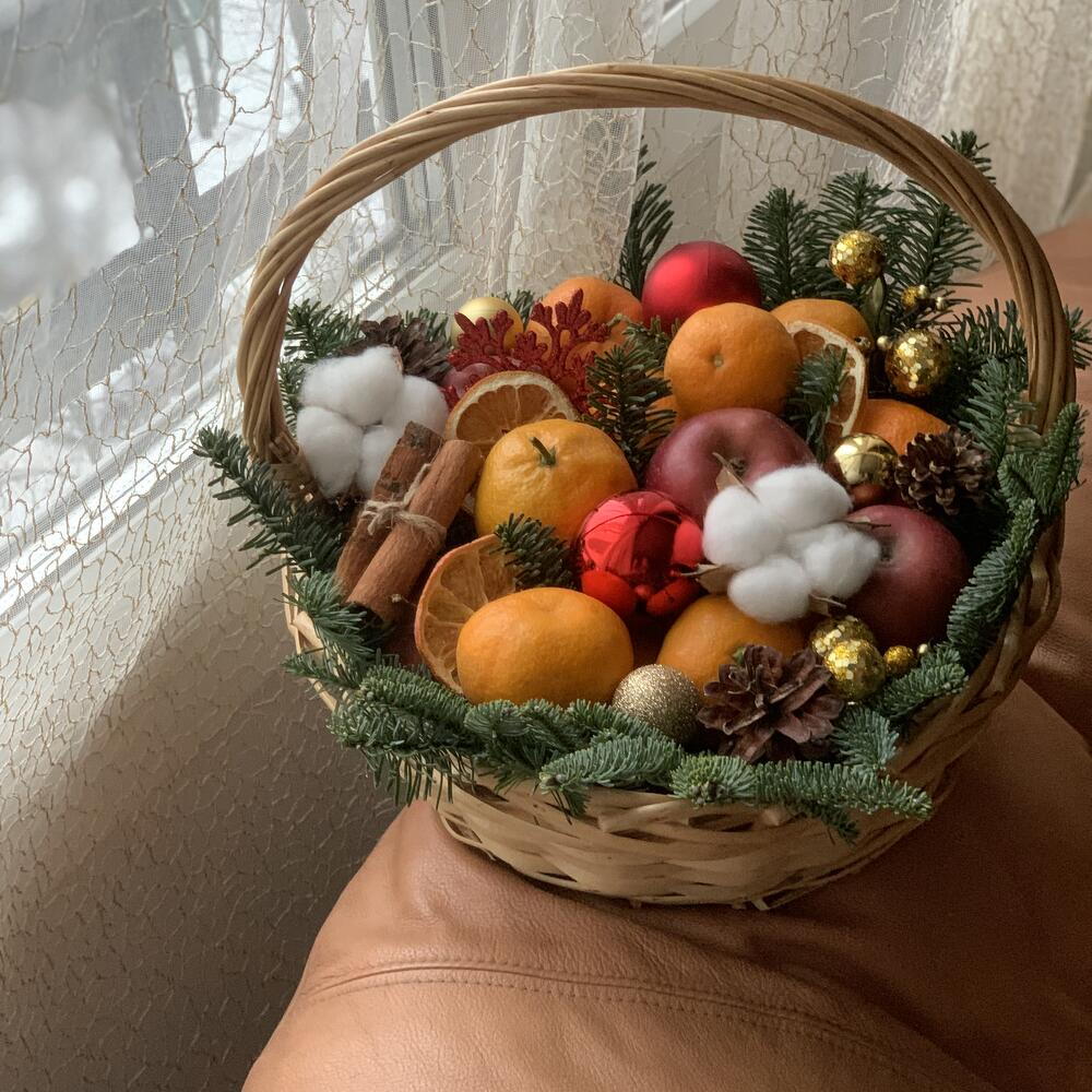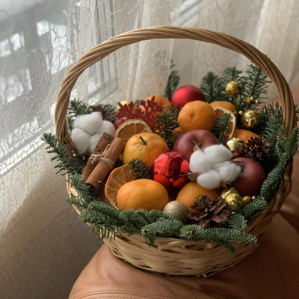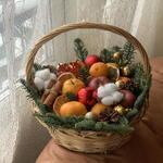 Корзина - 1 шт. Хлопок - 2 шт. Нобилис - 4 шт. Корица палочки - 2 шт. сушеные апельсины - 3 шт. мандарины - 13 шт. яблоки красные - 3 шт. Шишка Ели - 3 шт. елечная игрушка - 7 шт.