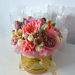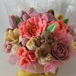 Indulge in a charming bouquet composed of delightfully handcrafted chocolate flowers. Each flower is meticulously made with an exquisite blend of premium ingredients. The allure begins with a base of finely granulated sugar, melded with decadent cocoa butter and the mellow richness of whole milk powder. A sensuous touch of cocoa mass is added to the mixture, creating a deep yet sophisticated chocolatey flavor. The inclusion of a subtle hint of soya lecithin ensures a silky, melt-in-your-mouth texture. The overall experience is perfected with a whisper of natural vanilla, which leaves a lingering aromatic sweetness with every bite. This intricately designed chocolate bouquet is the epitome of sweetness and elegance, promising an unforgettable indulgence in each bloom.