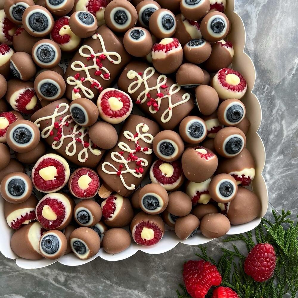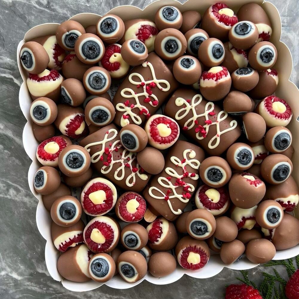 A beautiful box of chocolate-covered raspberries, blueberries, and bananas makes a delicious dessert that pairs well with tea, coffee, or champagne.