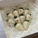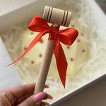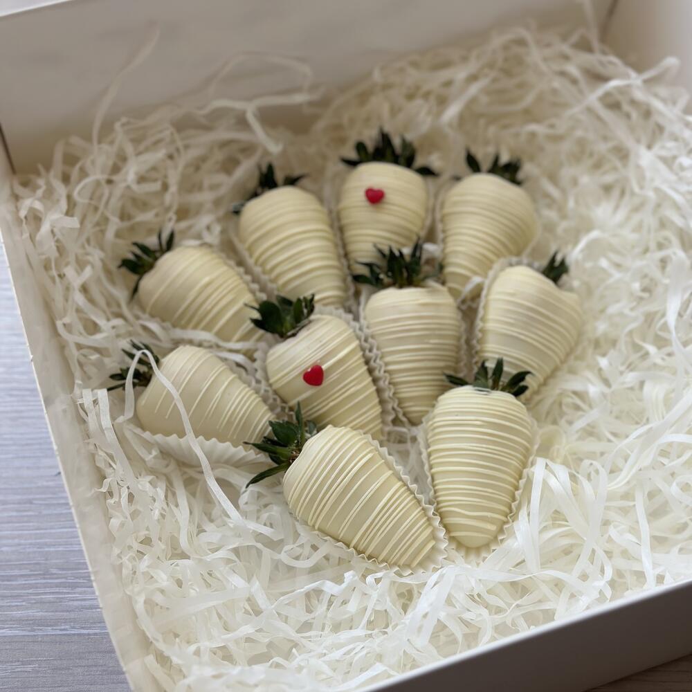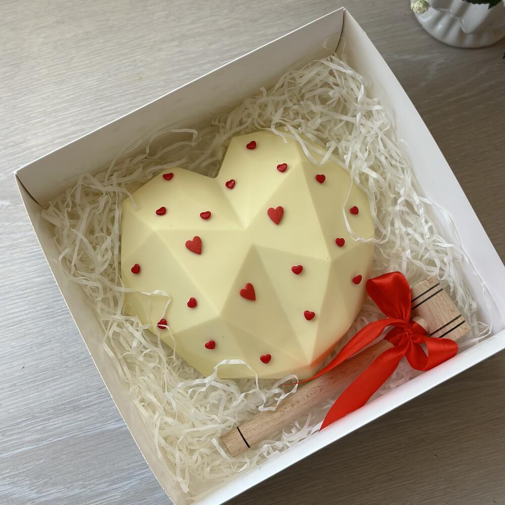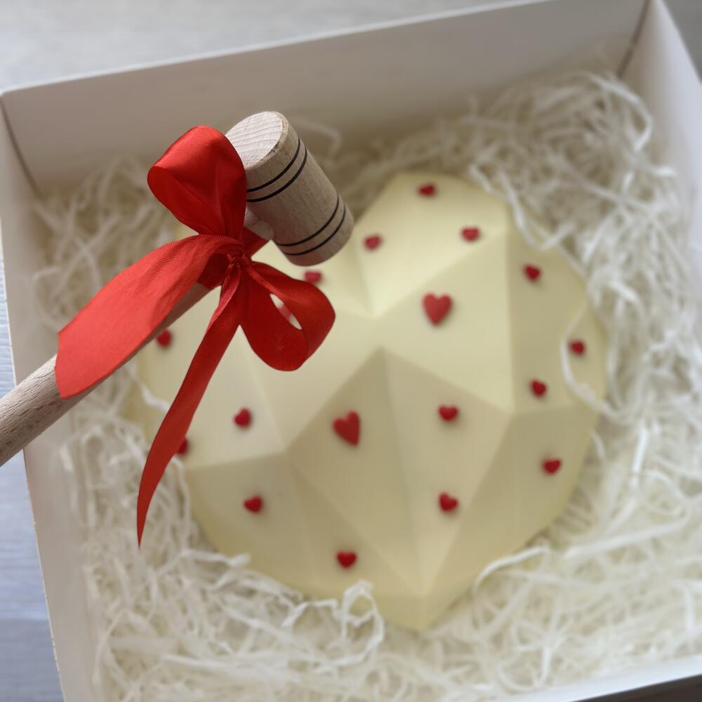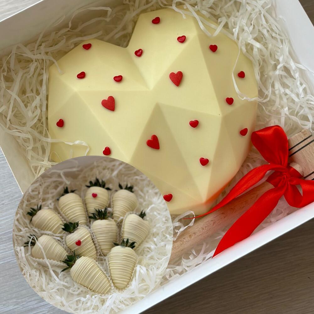 Сердце из белого шоколада -1шт Состав шоколада: сахар, масло какао (27,4%), сухое цельное молоко, эмульгатор: соевый лецитин, ароматизатор натуральный: ваниль Клубника в белом шоколаде - 7шт Деревянный молоток для шоколада - 1шт Коробка - 1шт Атласная лента - 2шт