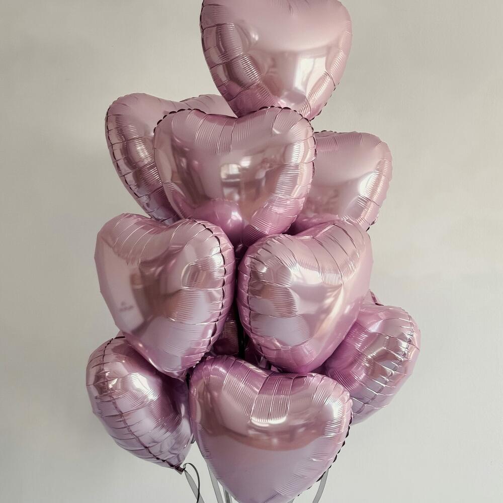 Комплект включає: 13 фольгованих сердечок (доступні кольори: рожевий, білий, червоний, бежевий та рожево-золотий) ДЕТАЛЬНІШЕ У ціну входить: повітряні кульки, наповнені гелієм, герметичний гель, стрічки, вантажі та сумки для перенесення.