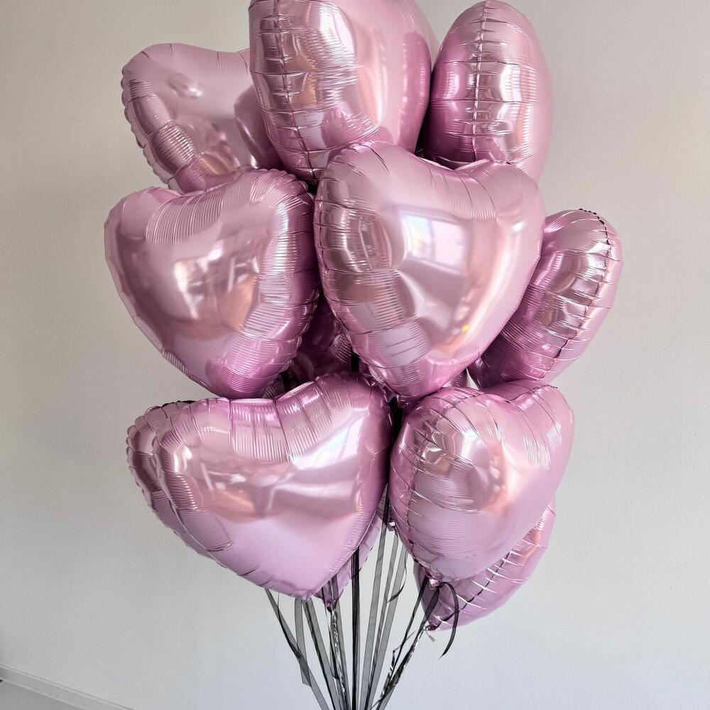 Набір містить: 17 фольгованих сердець (кольори на вибір: рожевий білий червоний бежевий рожеве золото) ДЕТАЛІ Ціна включає: кульки, наповнені гелієм, герметизуючий гель, стрічки, обтяжувачі, мішки для транспортування.