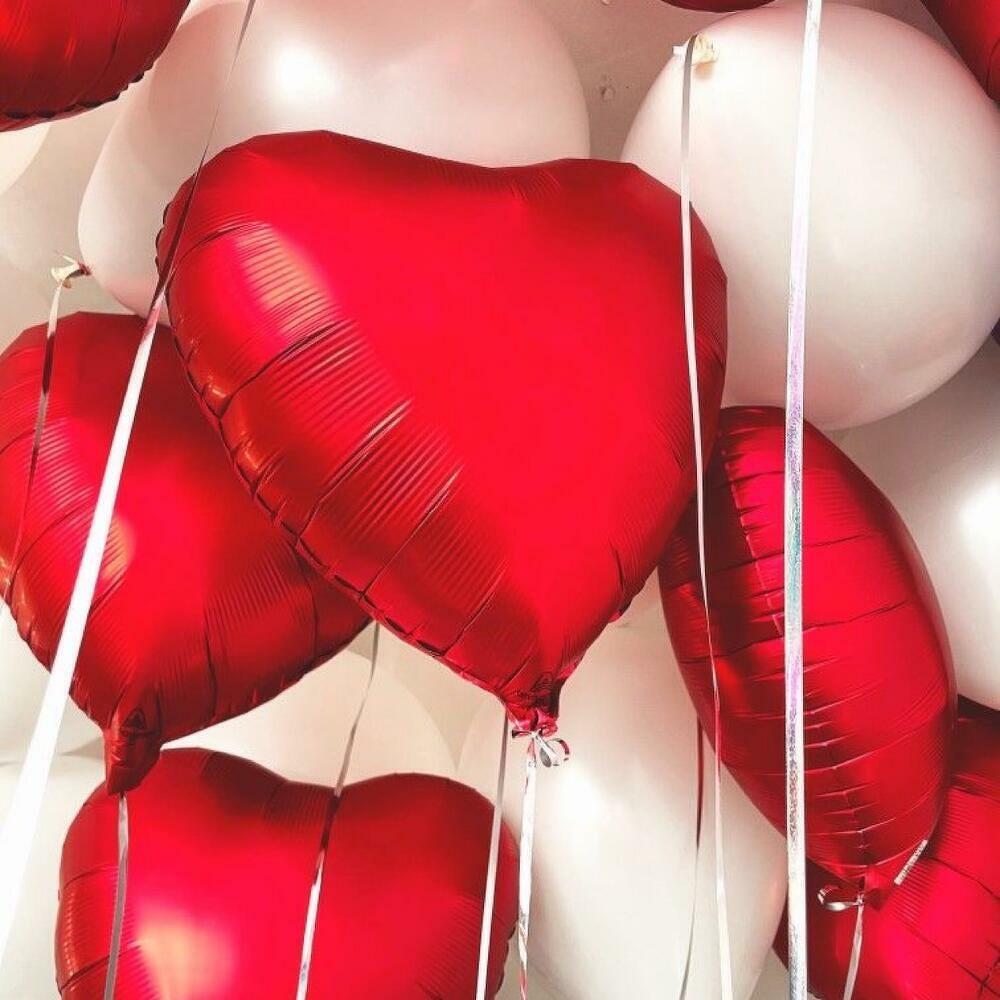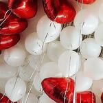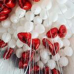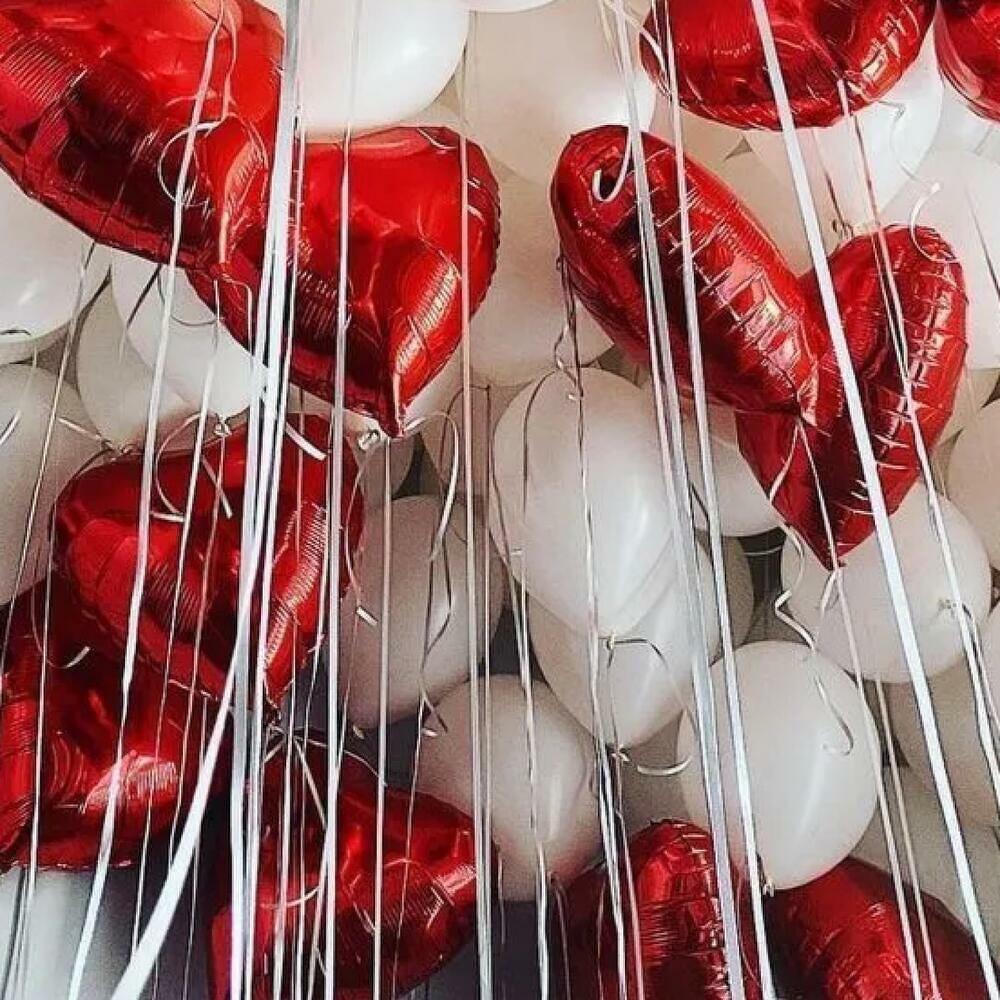 Романтичное оформление квартиры под ключ. Шикарный набор в бело-красной гамме, состоит из качественных, латексных, белых шаров наполненных гелием 55 шт и 20 фольгированных, красных сердечек с гелием 45 см
