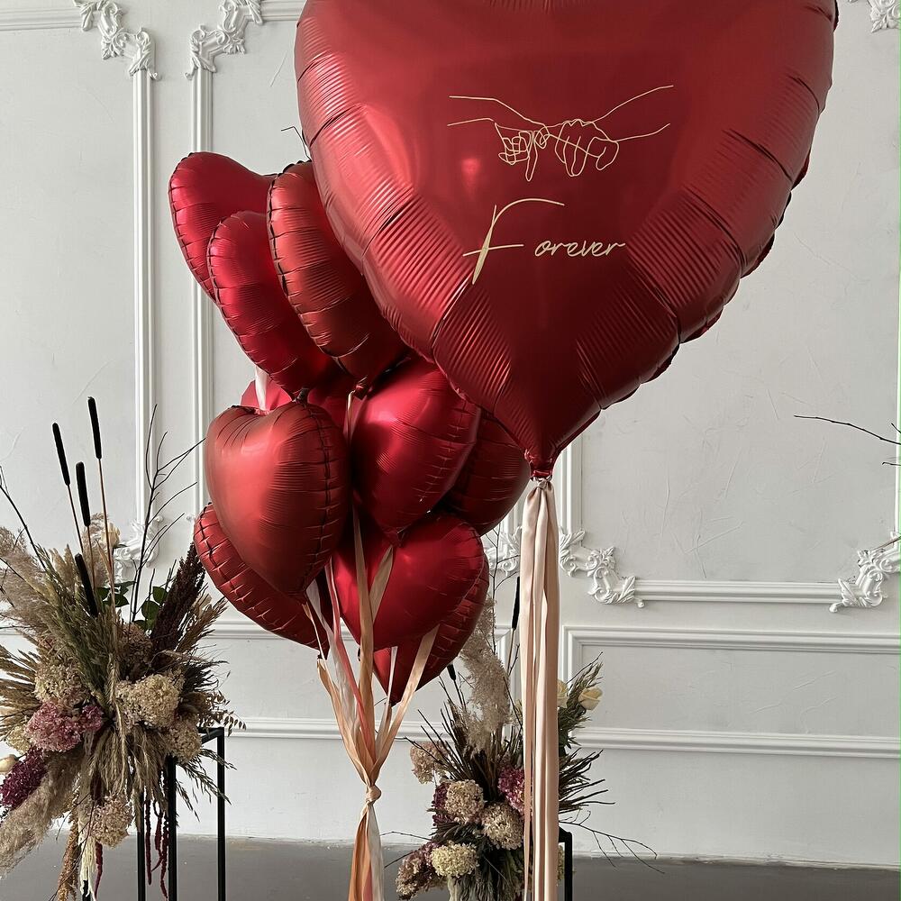 Набір містить: 10 фольгованих сердець на сатинових стрічках 1 серце XXL з принтом ДЕТАЛІ Ціна включає: кульки, наповнені гелієм, герметизуючий гель, стрічки, обтяжувачі, мішки для транспортування.