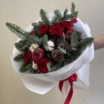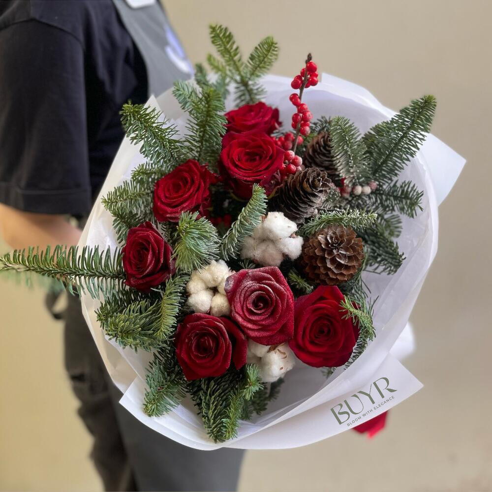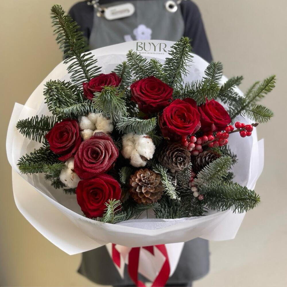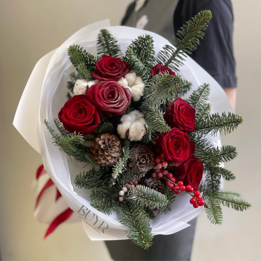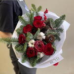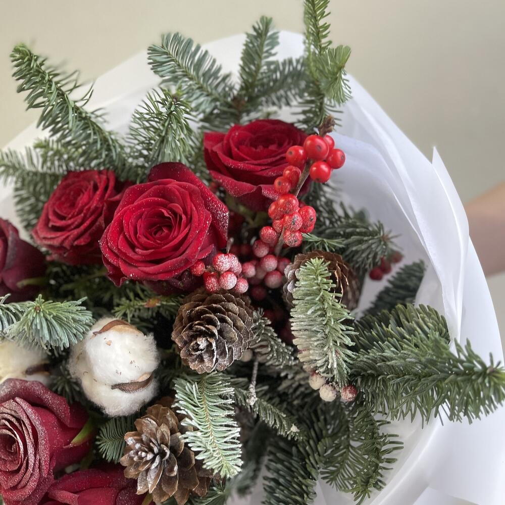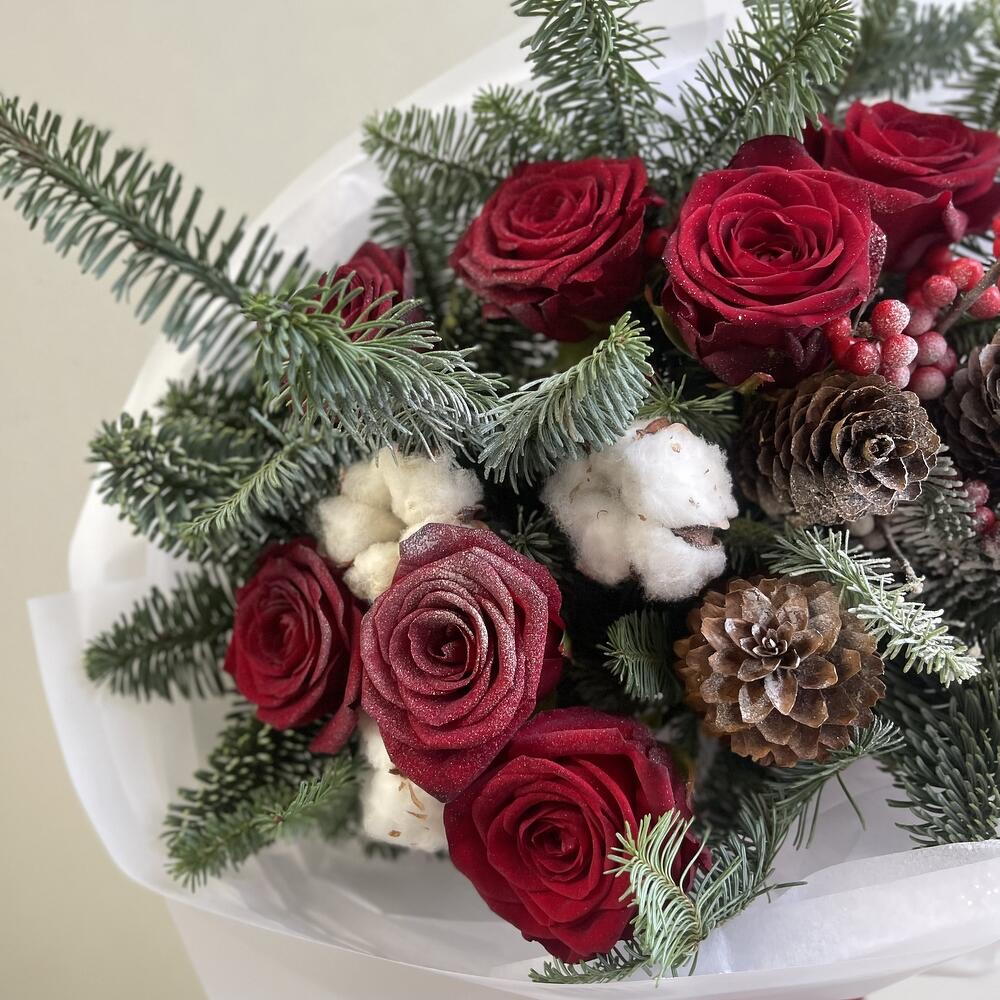 Яркий зимний букет с красными розами, шишками и хлопком в обрамлении роскошного нобилиса станет прекрасным подарком для дорогого человека в эти зимние дни