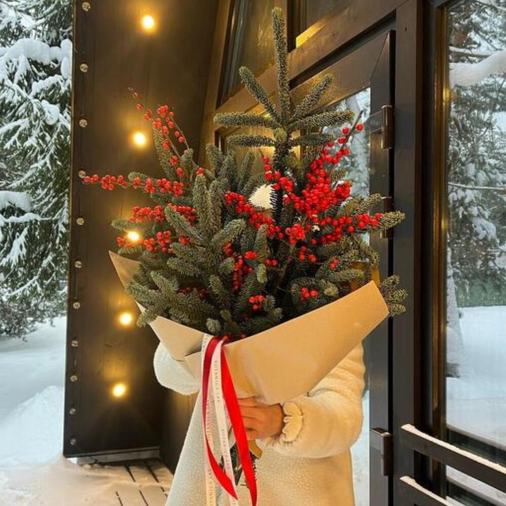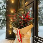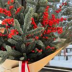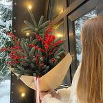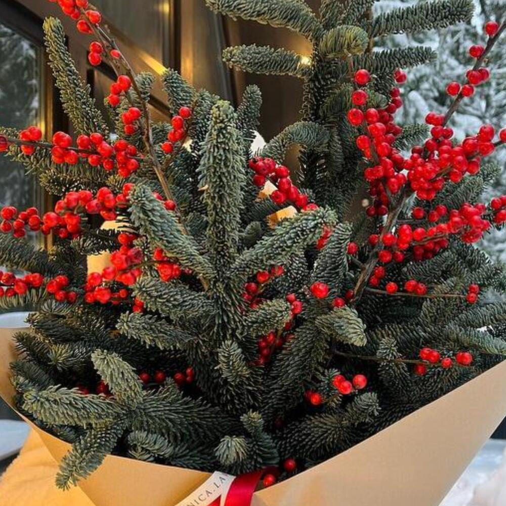 Праздничный зимний букет из веток ели и ярких ягод в стильной упаковке. Этот букет наполняет пространство атмосферой зимней сказки и идеально подходит для украшения интерьера или в качестве подарка. Добавьте нотку праздника в свой день с этим уютным и эффектным композицией!