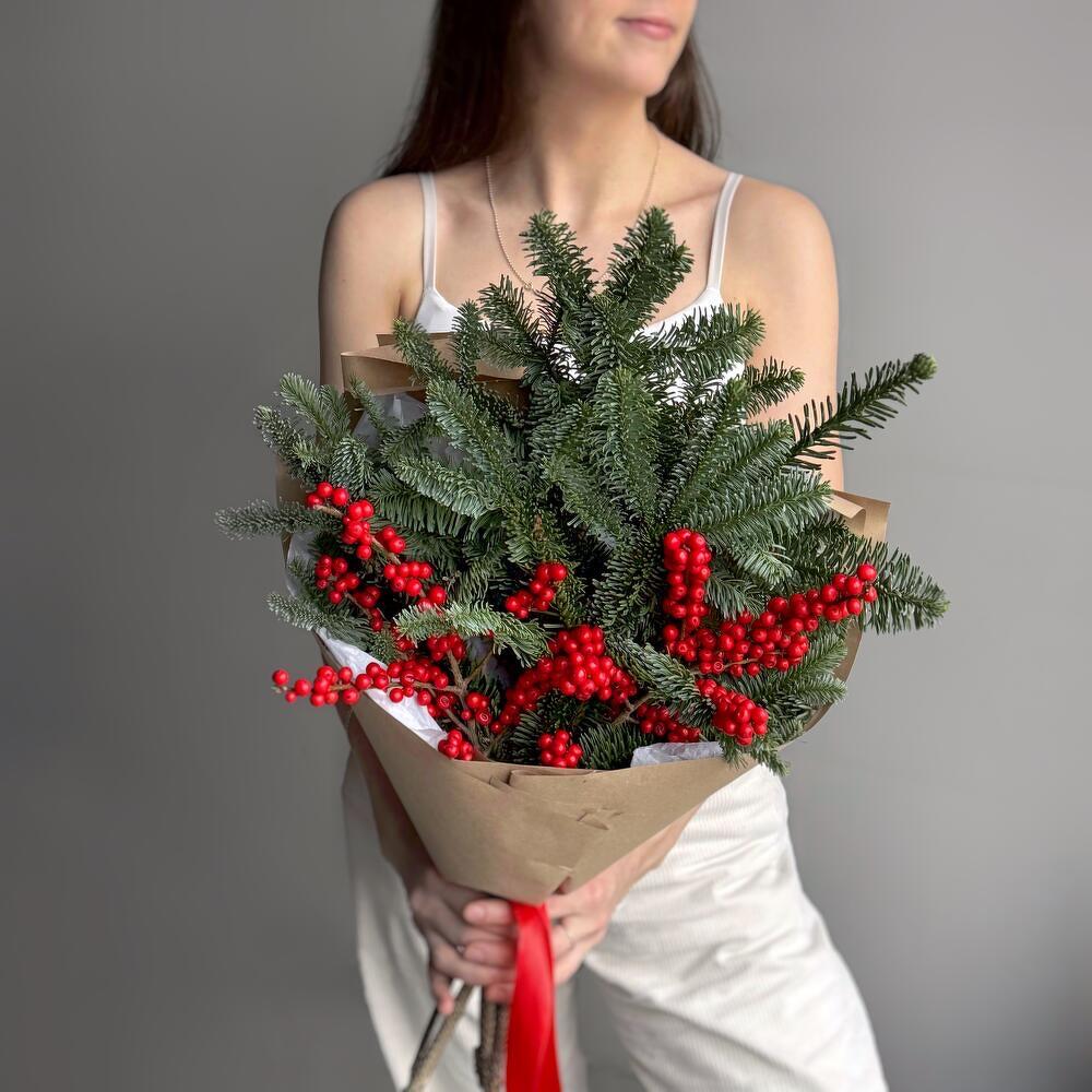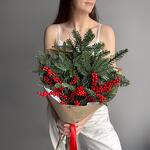 Новогодний букет из ели и красных ягод илекса для максимального поднятия настроения :) Не храните букет на прямых солнечных лучах и возле отопительных приборов, чтобы сохранить композицию свежей как можно дольше. Обратите внимание на фото в полный рост и написанные размеры товара