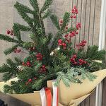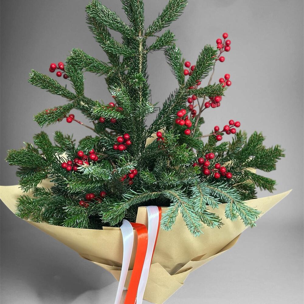 Очаровательный букет из веток ели, украшенный яркими красными ягодами и стильной упаковкой. Идеальный выбор для создания праздничного настроения.